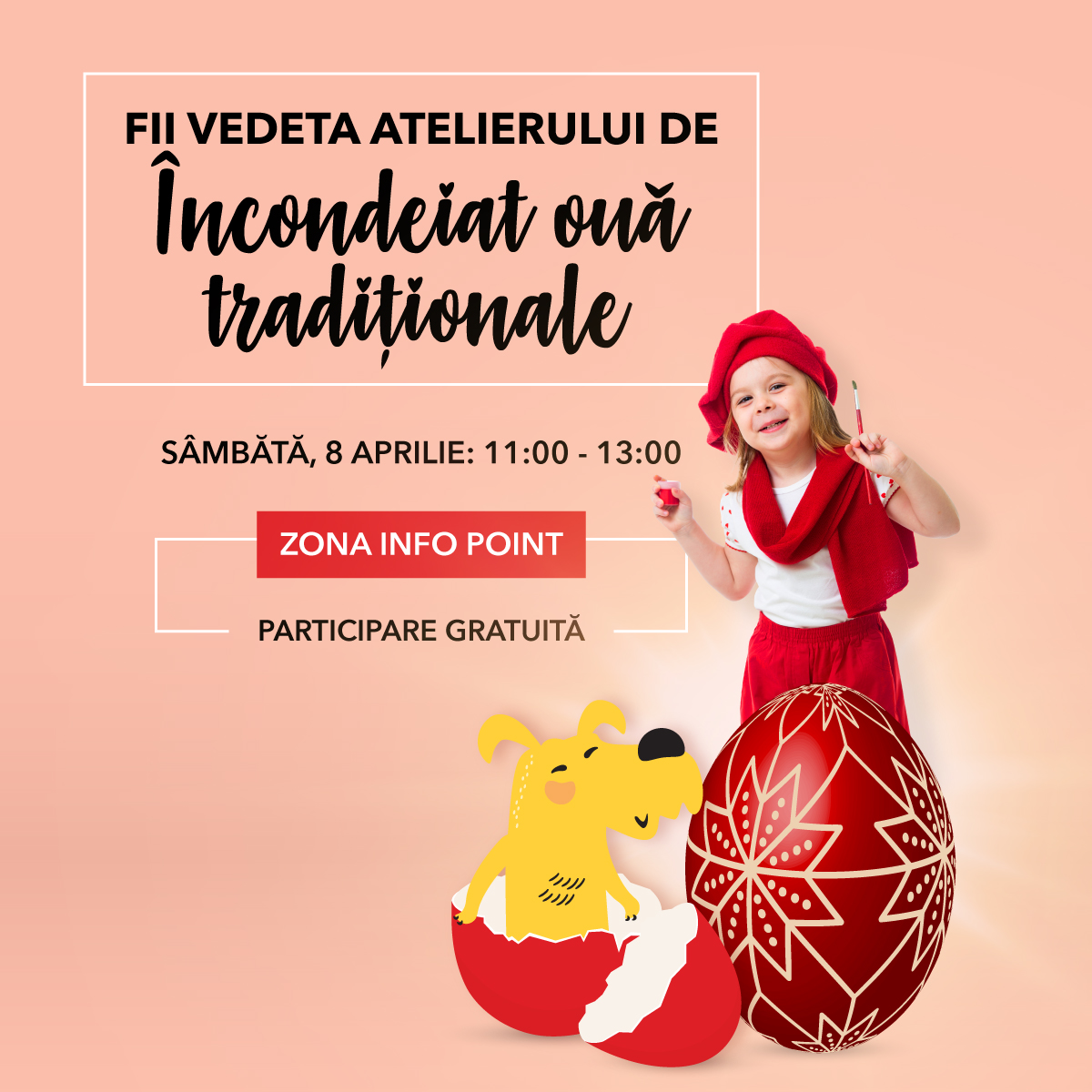 Sâmbătă, 8 aprilie, sibienii vor putea învăța arta încondeierii ouălor de la doi artiști populari din zona Moldovei, acolo unde tradiția și meșteșugul se transmit din generație în generație. Atelierul va avea loc în zona Info Point, în intervalul 11.00 - 13.00.