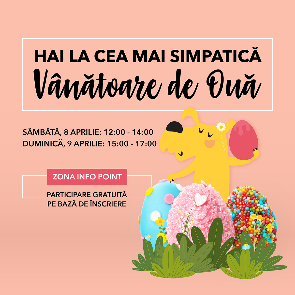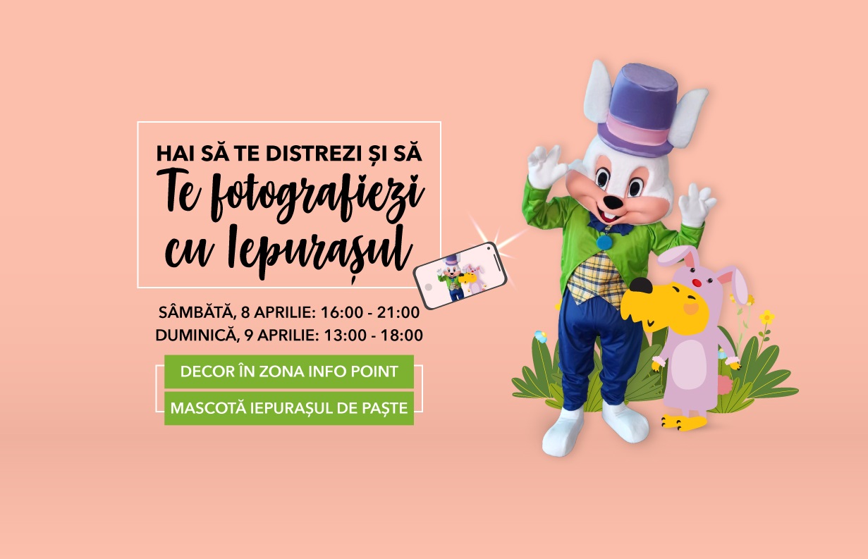 Tot în zona Info Point, în weekendul 8-9 aprilie, vizitatorii vor găsi amenajat un colț pentru fotografii cu decor pascal, iar Iepurașul de Paște va fi și el prezent pentru a face poze alături de copii. Mascotele iepuraș vor fi prezente la Shopping City Sibiu sâmbătă, 8 aprilie, în intervalul 16.00 – 21.00, respectiv duminică, 9 aprilie, în intervalul 13.00 – 18.00.