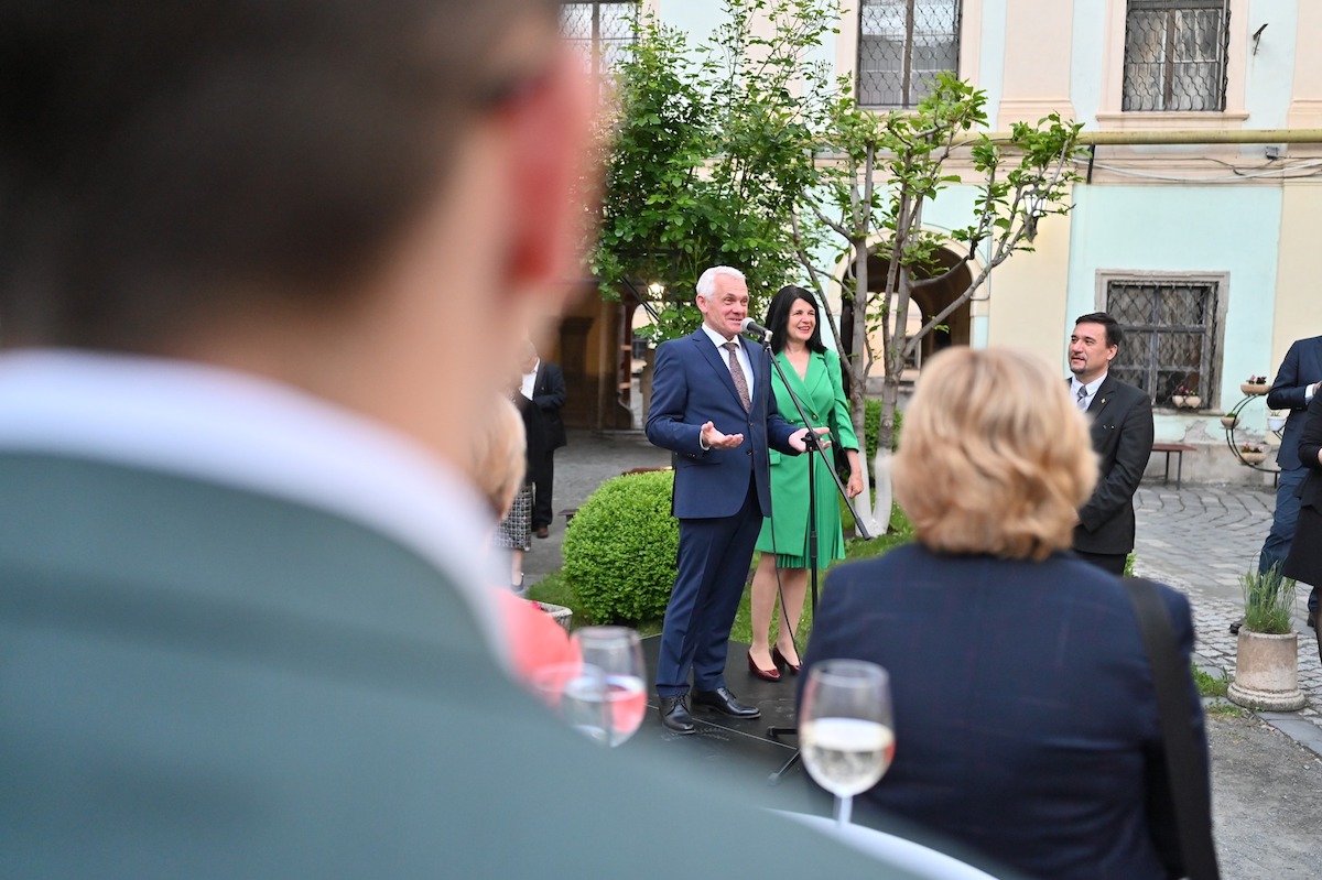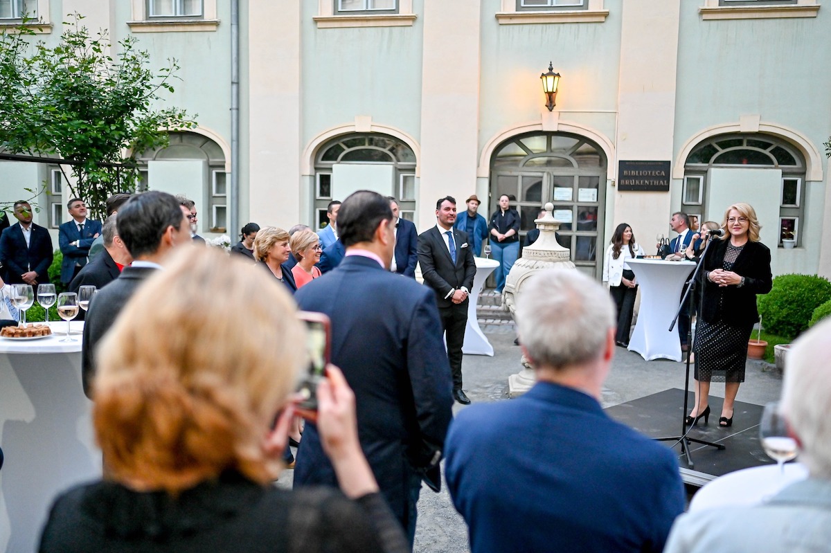 Recepția organizată în curtea Muzeului Brukenthal din Piața Mare a fost deschisă de Alexandru Constantin Chituță, manager interimar. Au luat cuvântul Mircea Dorin Crețu, prefectul județului Sibiu, urmat de Astrid Cora Fodor, primarul Municipiului Sibiu și Traian Hristea, secretar de stat al Ministerului Afacerilor Externe.