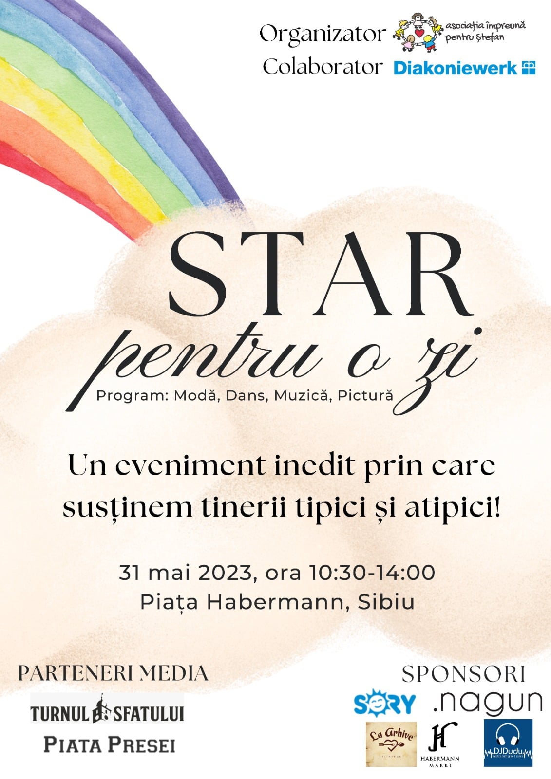 Miercuri, 31 mai, de la ora 10.30, sibienii sunt invitați în Piața Habermann, acolo unde va avea loc evenimentul „Star pentru o zi”. În cadrul acestuia copii și adulți cu dizabilități din județul nostru vor prezenta moda, vor dansa, vor cânta și picta. Scopul evenimentului este acela de a învăța societatea să accepte, să integreze și să susțină persoanele cu dizabilități. Alături de acești copii vor fi și tineri de la Palatul Copiilor din Sibiu și de la Centrul de Educație Incluzivă Nr. 1 din Sibiu care se vor alătura în dans și cântec și vor aduce cu ei nenumărate alte surprize. Oricine își dorește poate participa ca spectator și îi poate încuraja pe artiști. Accesul este gratuit. De asemenea, cei care doresc să-i sprijine pe tinerii cu dizabilități o vor putea face prin donații.