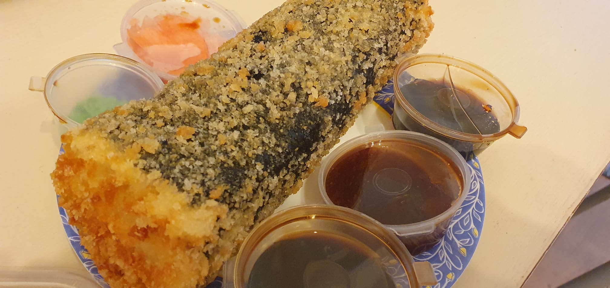 Haideți să le luăm la rând. Șaorma este un fel de rulou din orez care îmbracă un miez din brânză și pui cu legume, precum castravete și ceapă verde, care apoi pare prăjit câteva secunde pentru a deveni crocant la exterior. Nu-mi dau seama dacă este mai bogat în calorii decât o șaorma adevărată, însă vine cu trei sosuri foarte apetisante. Cert este că este o combinație care merge, poate deveni o alternativă la clasica „cu de toate”. Ai atâtea opțiuni încât din 50 de îmbucături nu sunt două la fel.