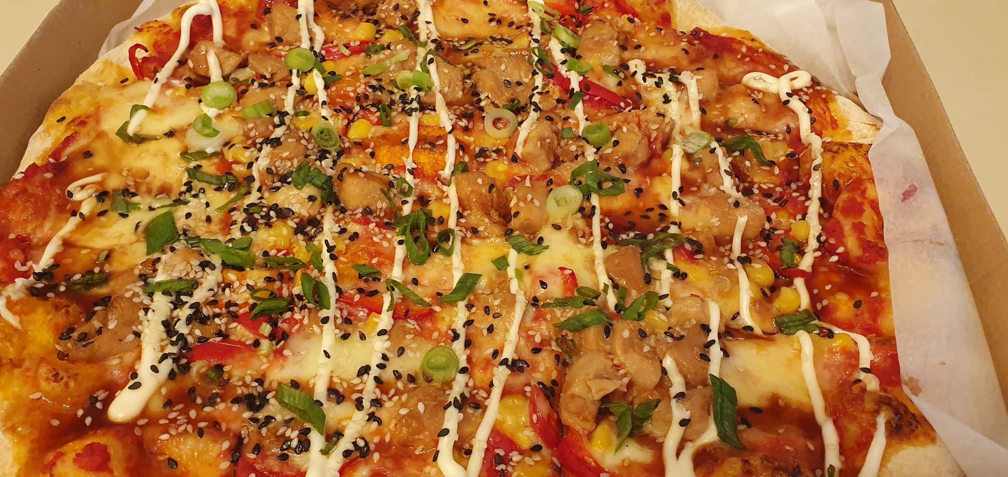 Pizza este și mai ciudată. Se simte la gust ca și cum au luat niște noodles trași la wok cu sos dulce-sărat și l-au transpus pe un aluat rumenit la cuptor. Cinci bucătari italieni s-au întors în morminte cât am mâncat eu cu poftă. Nu simți aroma clasică de pizza, deși are sos tomat și blat ușor crocant la exterior, pufos la interior. Mai degrabă te duce cu gândul la esența mâncărurilor asiatice într-o gură plină. Nu cred că este un preparat pentru toată lumea, ci mai degrabă pentru cei care apreciază bucătăria asiatică, iuțeala și acreala îndulcită. Este de departe cea mai ciudată pizza din Sibiu, mult peste abominațiile de pizza cu cartofi prăjiți. De ananas nici nu mai zic.
