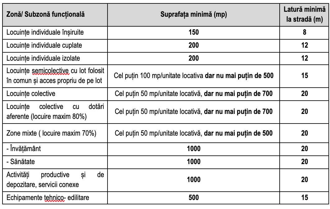 - pentru locuințele individuale se păstrează prevederile din Regulamentul General de Urbanism, și anume 150mp/locuință înșiruită și 200mp/ locuință individuală sau cuplată.