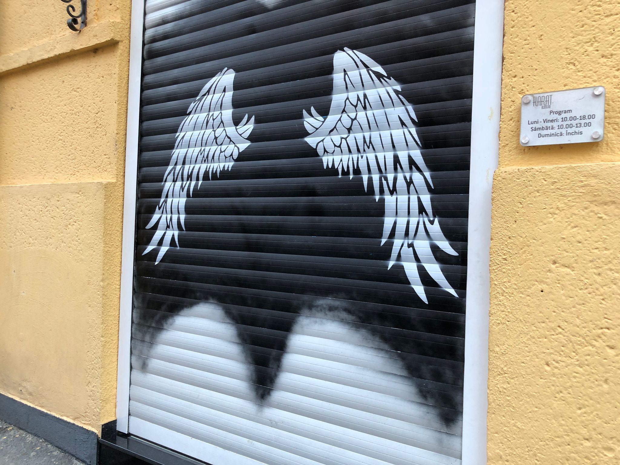 1. Ușile Bijuteriei Karat – pe strada Timotei Popovici ne atrag atenția ușile unei bijuterii cu o vechime destul de mare în Sibiu. În momentul în care acestea sunt închise se poate observa o pictură cu două aripi albe de înger, pe un fundal negru;