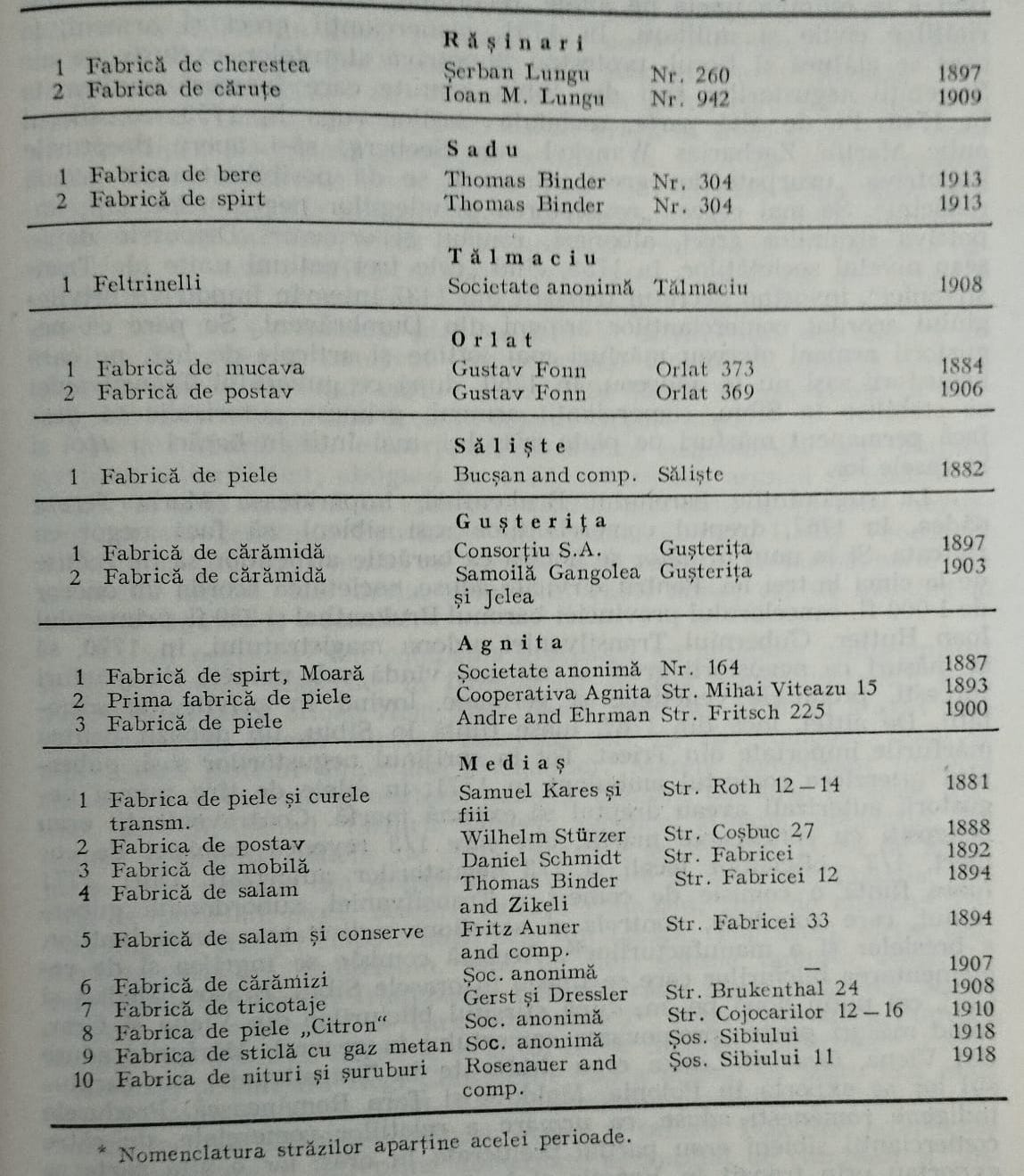 Autorii au întocmit și o listă cu fabricile care activau în Sibiu înainte de Unirea din 1918: