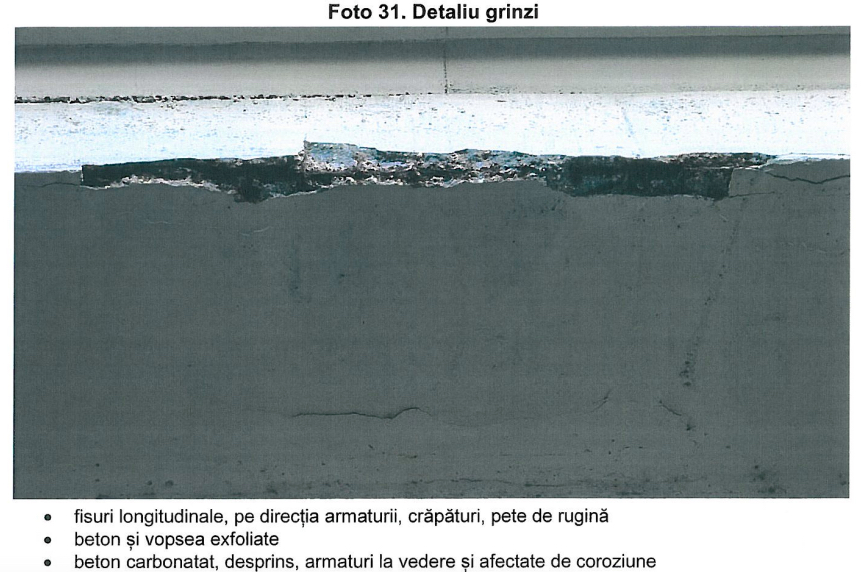 - Fisuri și exfolieri ale betonului și la grinzi din deschiderile centrale.