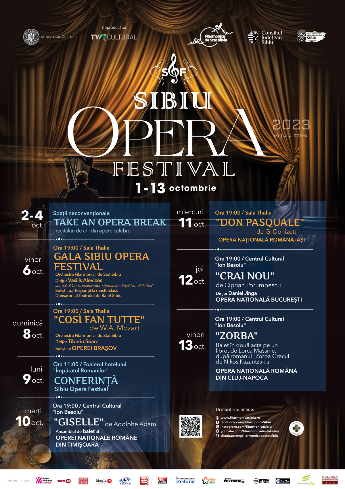 Cea de a XXII-a ediție a festivalului care transformă Sibiul în capitala operei din România va fi organizată de Filarmonica de Stat Sibiu în perioada 1-13 octombrie. Anul acesta, la Sibiu Opera Festival se reunesc cele mai importante opere din țară - București, Cluj-Napoca, Timișoara -, soliștii Operei Brașov și, pentru prima dată, Opera Națională Română din Iași. Programul complet al festivalului poate fi consultat pe www.filarmonicasibiu.ro și în aplicația mobilă oficială Filarmonica Sibiu App.