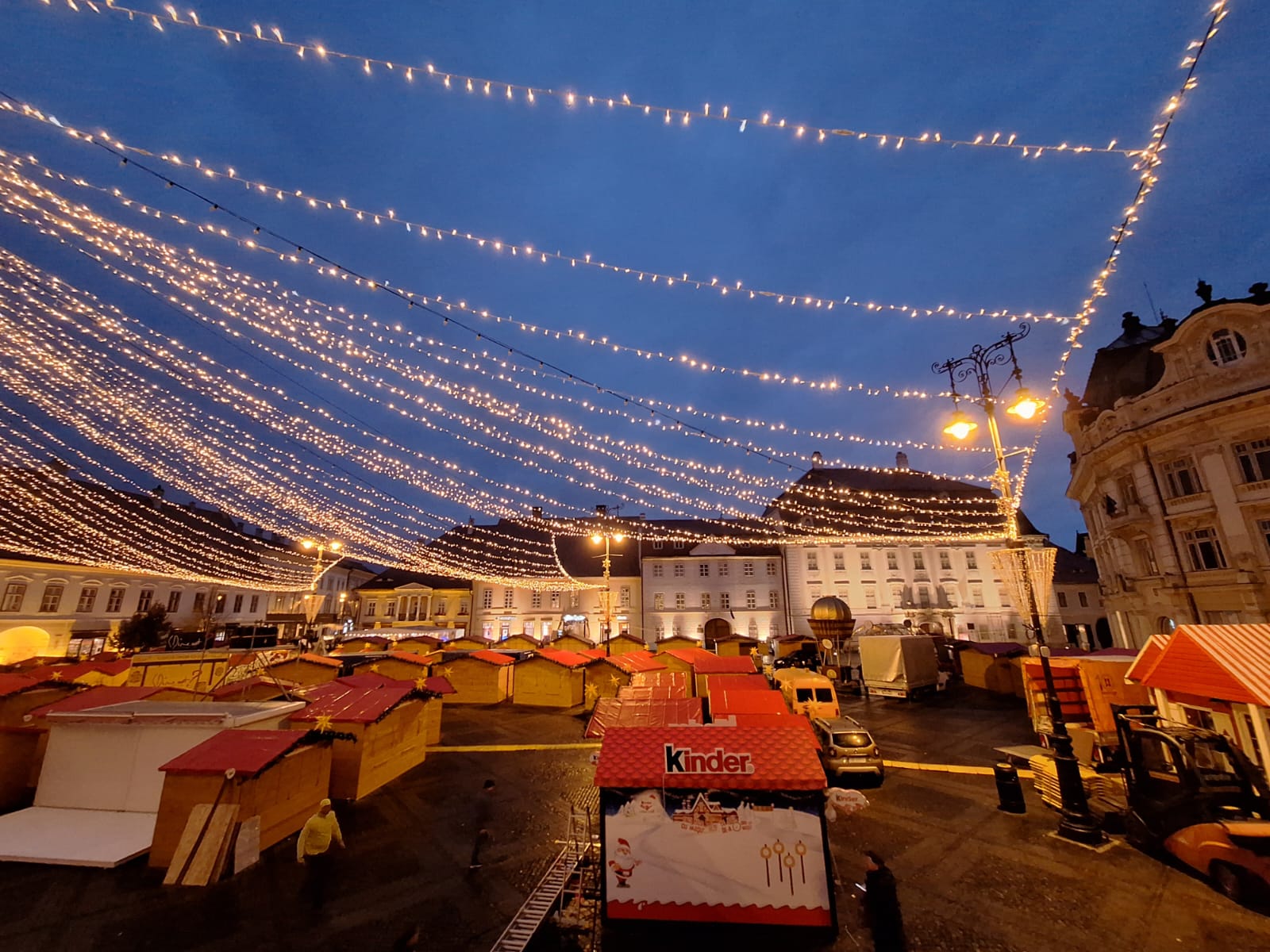 Se fac ultimele pregătiri înainte de inaugurarea Târgului de Crăciun de la Sibiu. Marți seară a fost aprinsă plasa de lumini, precum și luminile de pe brad, pentru a verifica dacă funcționează.