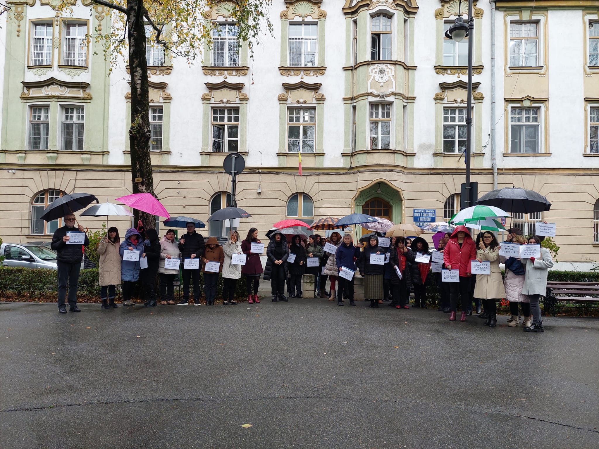 În ciuda ploii mărunte și a frigului de afară, toți angajații Direcției de Sănătate Publică Sibiu au ieșit în fața instituției pentru a protesta timp de două ore, între 9.00 și 11.00. Lipsesc doar cei care erau pe teren cu activități deja programate și nu au putut fi sistate.