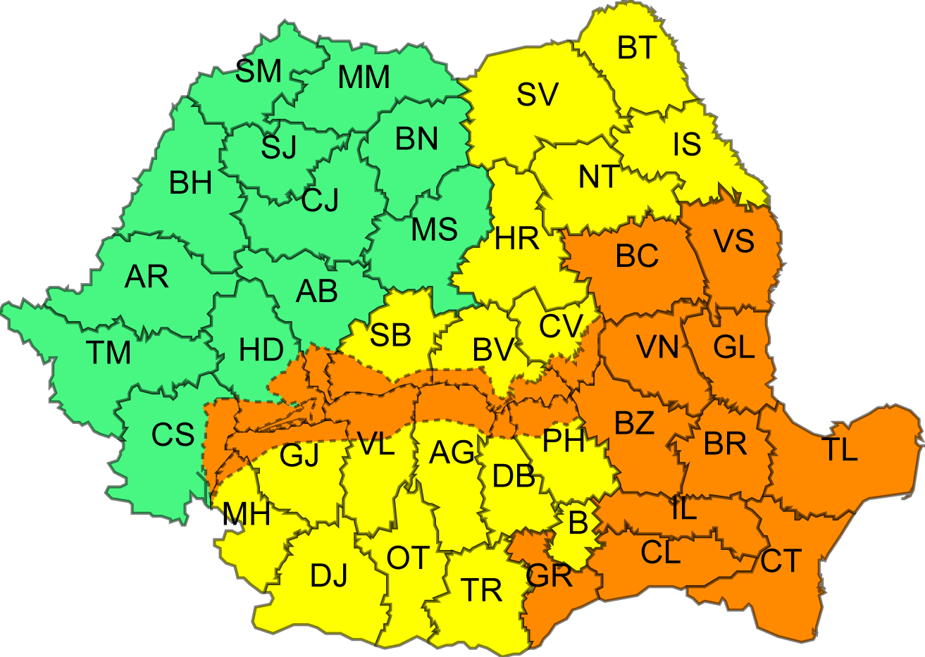 Restul județului se află sub o avertizare cod galben. Potrivit meteorologilor, aici va ploua, apoi treptat, începând din noaptea de sâmbătă spre duminică (25/26 noiembrie) vor predomina ninsorile. Cantitățile de apă vor fi de 25...35 l/mp.Vântul va avea intensificări, cu rafale în general de 60...75 km/h, vor fi intervale cu viscol și vizibilitate scăzută.
