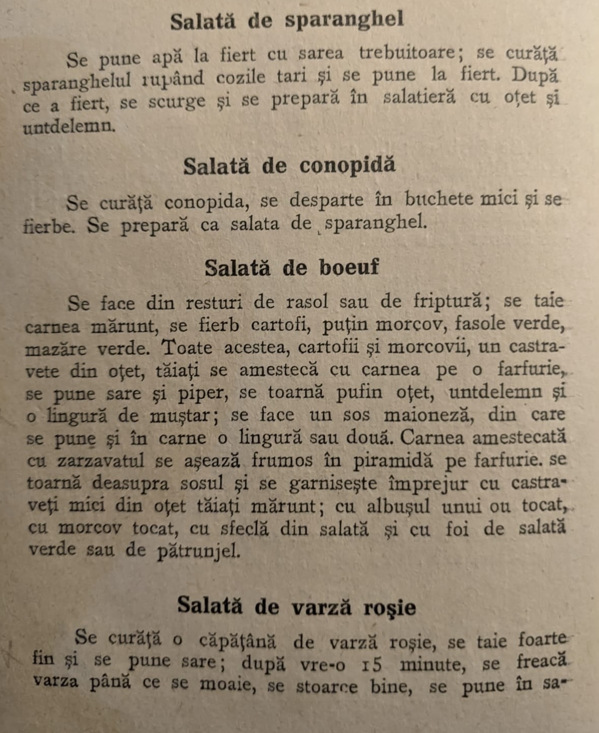 ”Se taie carnea mărunt, se fierb cartofii, puțin morcov, fasolea verde, mazăre verde. Toate acestea, cartofii și morcovii, un castravete din oțel, tăiați se amestecă cu carnea pe o farfurie, se pune sare și piper, se toarnă puțin oțet, untdelemn și o lingură de muștar. Se face un sos maioneză, din care se pune și în carne o lingură sau două. Carnea amestecată cu zarzavatul se așază frumos în piramidă pe farfurie. Se toarnă deasupra sosul și se garnisește împrejur cu castraveți mici din oțet, tăiați mărunt, cu albușul unui ou tocat, cu morcov tocat, cu sfeclă tăiată și cu foi de salată verde sau de pătrunjel”, se precizează în rețetă.