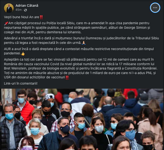 Adrian Cătană, senatorul AUR de Sibiu, a împărțit în zeci de grupuri de socializare vestea că a câștigat un proces cu Poliția locală Sibiu. Care l-ar fi amendat în perioada pandemiei pentru că nu purta masca de protecție, în timp ce era în Piața Mare, alături de George Simion, liderul partidului. În realitate, amenda anulată era dată pentru adunări publice neautorizate.
