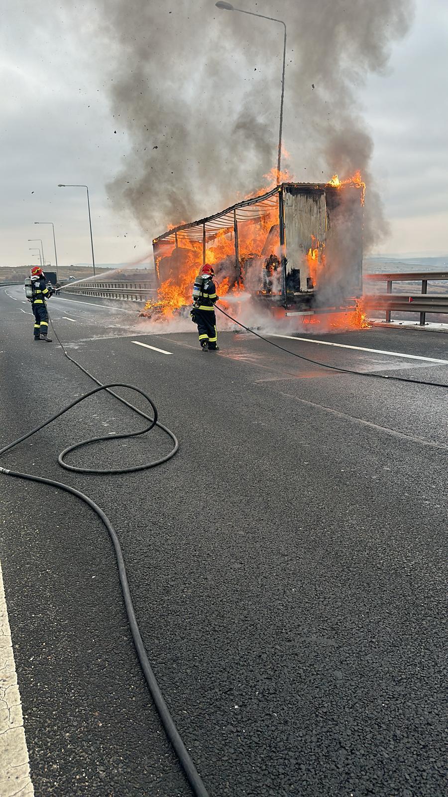 Incendiul se manifestă generalizat la un autocamion a cărui remorcă are o încărcătură de carton presat. Din fericire nu sunt victime, se acționează pentru stingere”, a precizat slt. Andreea Ștefan.