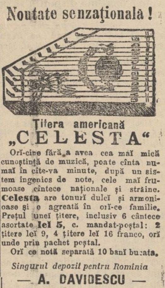 ”Noutate senzaţională! Țitera americană „CELESTA“. Oricine, fără a avea cea mai mică cunoştinţă de muzică, poate cînta numai în cîteva minute, după un sistem ingenios de note, cele mai frumoase cîntece naţionale şi străine. Celesta are tonuri dulci şi armonioase şi e agreată în orice familie. Preţul unei ţitere, inclusiv 6 cântece asortate, lei 5, cu mandat poştal: 2 ţitere, lei 9, 4 ţitere, lei 16 france, ori unde prin pachet poştal. Orice notă separată 10 bani bucata”, se preciza într-o reclamă dintr-un ziar din anul 1900.