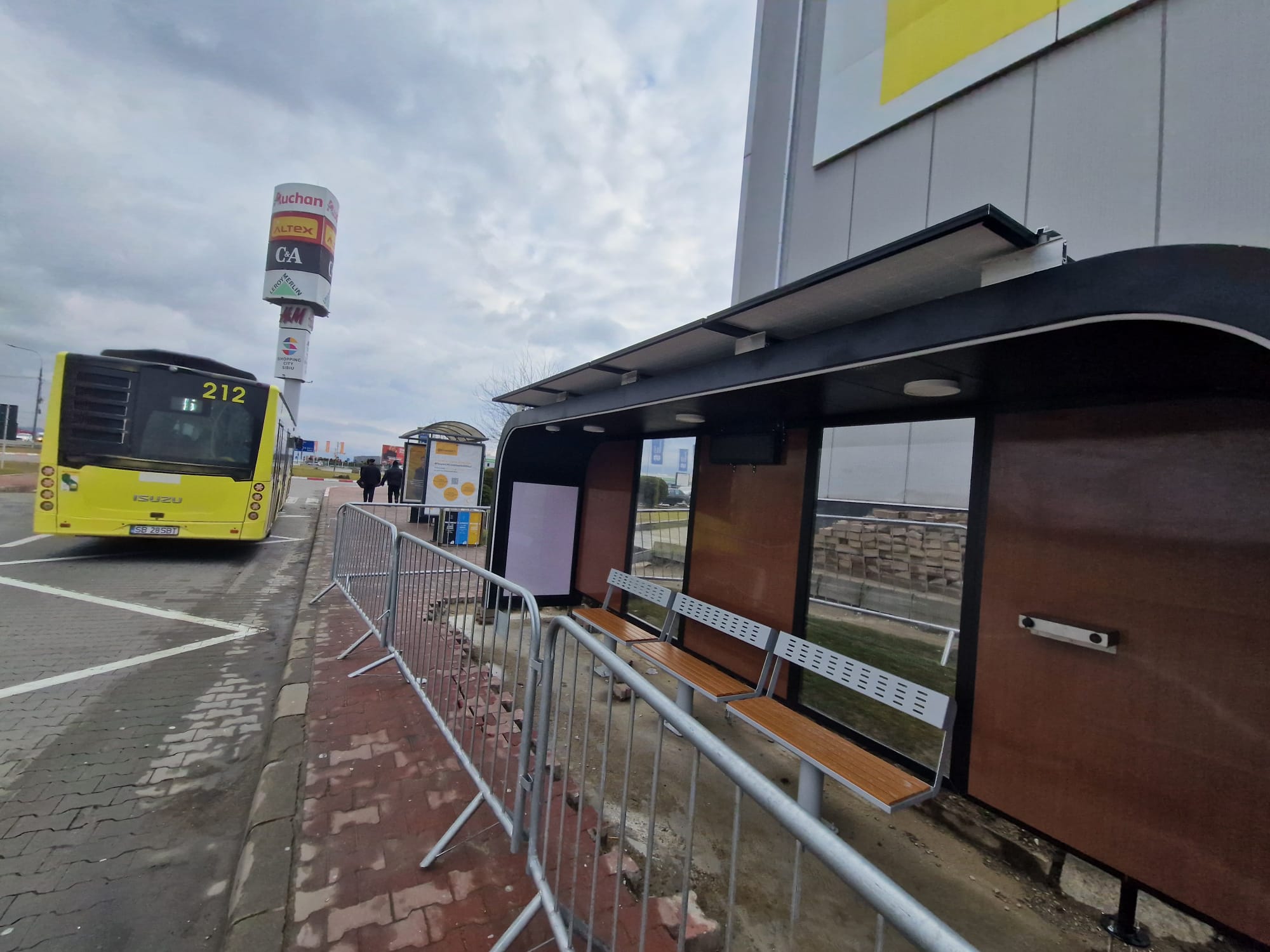 Pentru a avea un termen de comparație, iată cum arată o stație de autobuz nouă, în Șelimbăr, tot într-o zonă comercială de la marginea Sibiului: