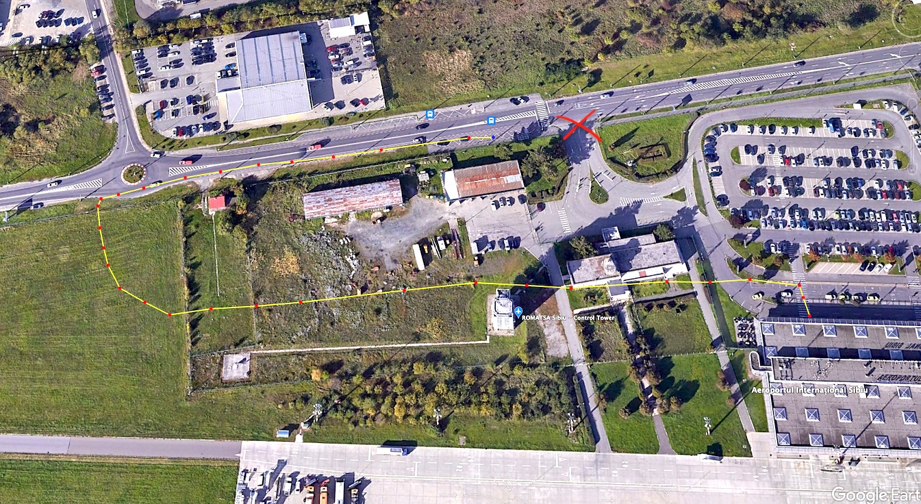 Cu roșu este marcat vechiul acces, blocat în prezent tuturor. Noul traseu pe care trebuie să îl parcurgă pietonii pentru a ieși din incinta aeroportului îi obligă la un ocol de sute de metri. Sursa foto: Google Earth (simularea traseului pe care pietonii sunt obligați să îl urmeze aparține redacției)