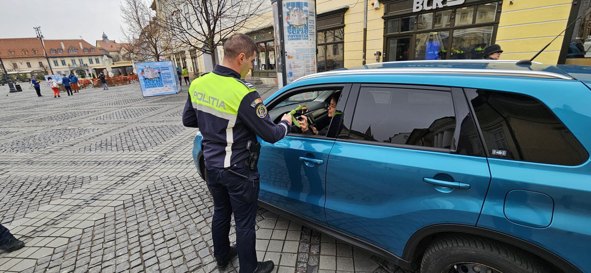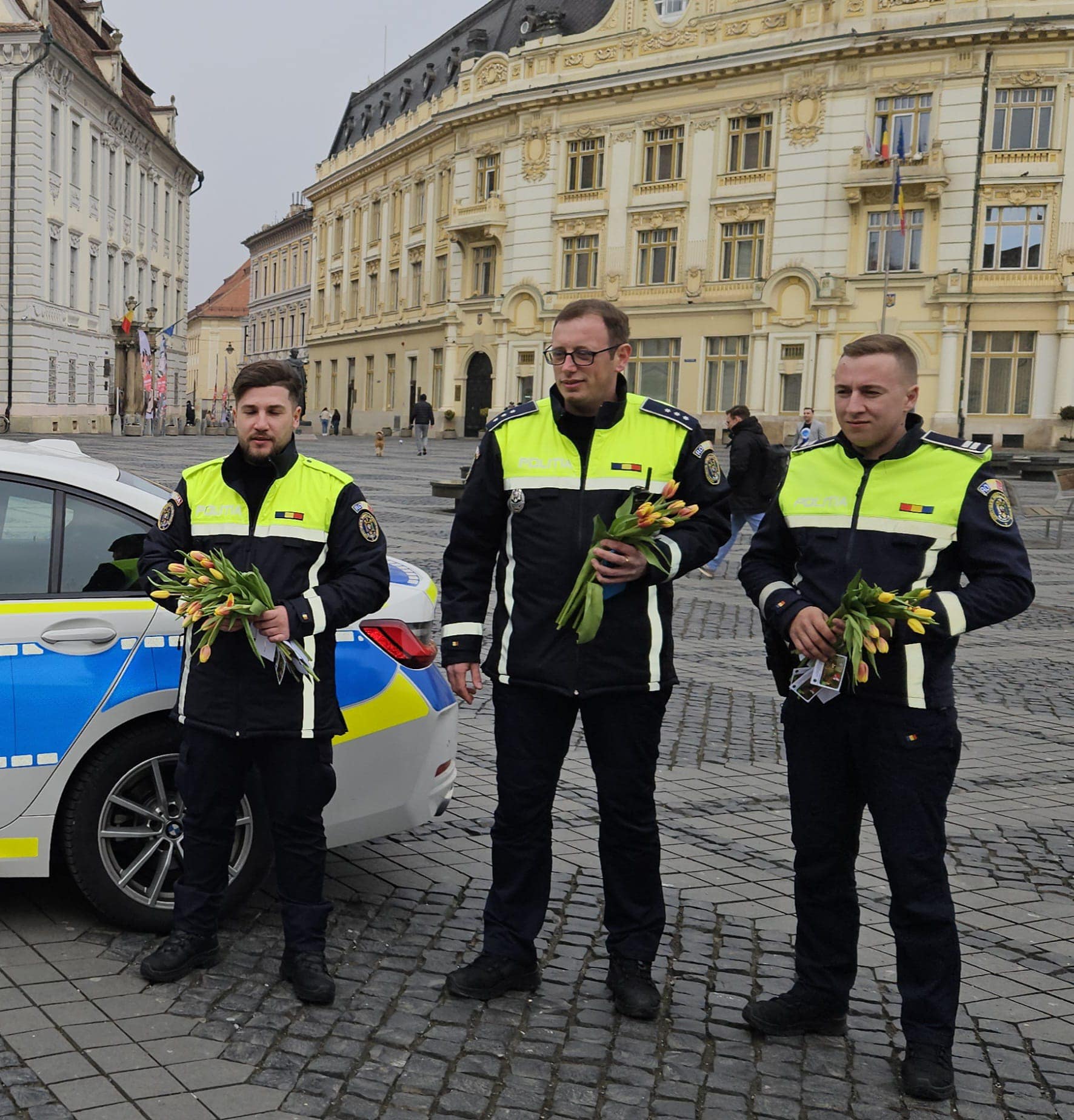 Polițiștii și jandarmii sibieni au împărțit flori doamnelor și domnișoarelor din Sibiu, cu ocazia zilei de 8 Martie.