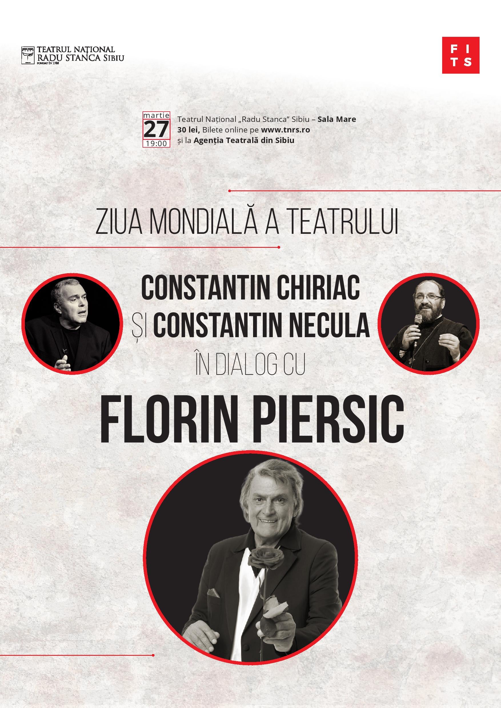 „De Ziua Mondială a Teatrului oferim în dar publicului din Sibiu și de pretutindeni un dialog cu o personalitate fără egal pe scena românească, Florin Piersic, căruia îi dedicăm această conferință aniversară și pe care-l iubim și îl respectăm! Ne bucurăm că avem șansa extraordinară de a avea pe scena Teatrului Național „Radu Stanca”, într-o zi cu o semnificație deosebită, un artist care este iubit de milioane de oameni și care a reușit, de-a lungul activității sale impresionante, să realizeze lucruri extraordinare în teatru, film și televiziune. Mulțumim, Florin Piersic și vă așteptăm, dragi iubitori ai teatrului, să sărbătorim împreună ziua specială a teatrului, dar și a lui Florin Piersic”, a declarat Constantin Chiriac, directorul general al Teatrului Național „Radu Stanca” Sibiu și președintele Festivalului Internațional de Teatru de la Sibiu.