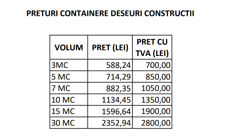 În situațiile în care cantitatea de deșeuri depășește 2 mc, este necesară închirierea unui container special destinat transportului deșeurilor din construcții și demolări. Containerele ce pot fi puse la dispoziție pot fi de 3mc, 5mc, 7mc și 10 mc.