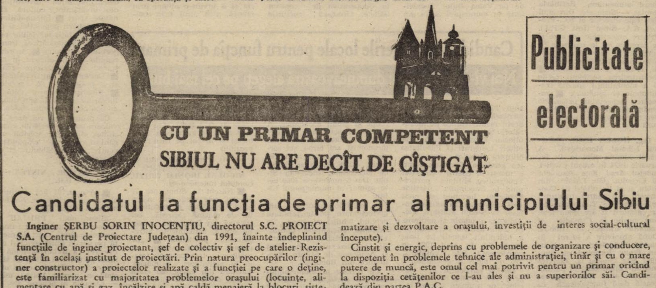 Tatăl lui Bogdan Trif, candida la Primăria Sibiu din partea FSN. ”Rog presa să nu mă laude nici pe mine, nici primăria”