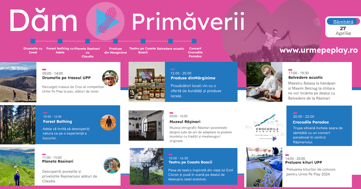 Organizatorii evenimentului „Urme pe play” ne invită în acest weekend, la Rășinari, la un eveniment cultural și sportiv ce își propune să promoveze mișcarea și cultura în natură, sub sloganul „Dăm PLAY Primăverii”.