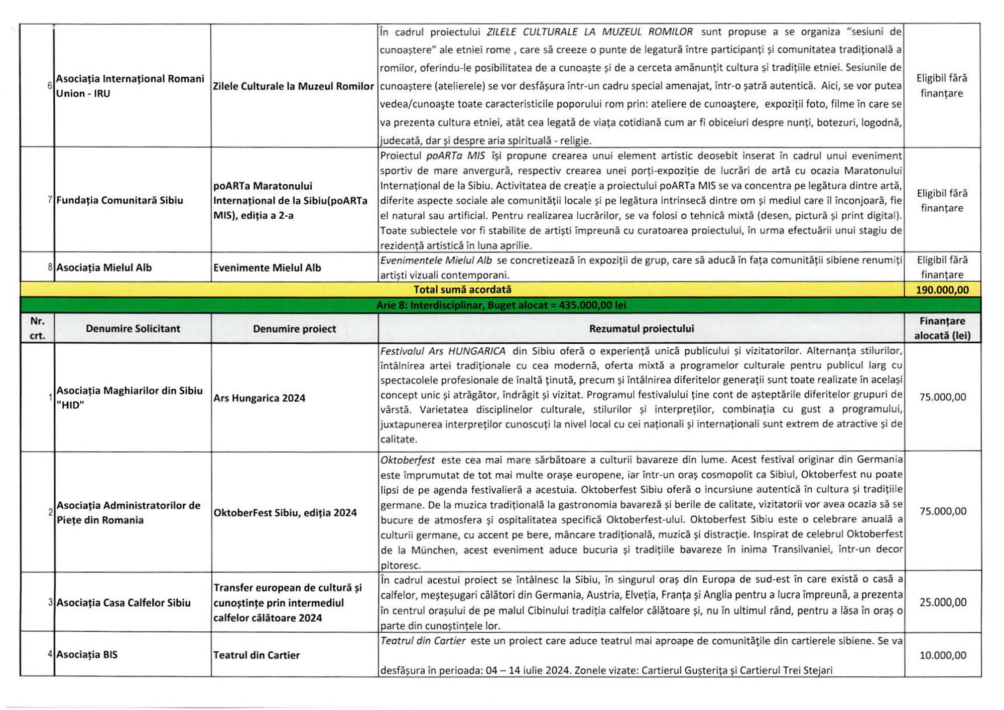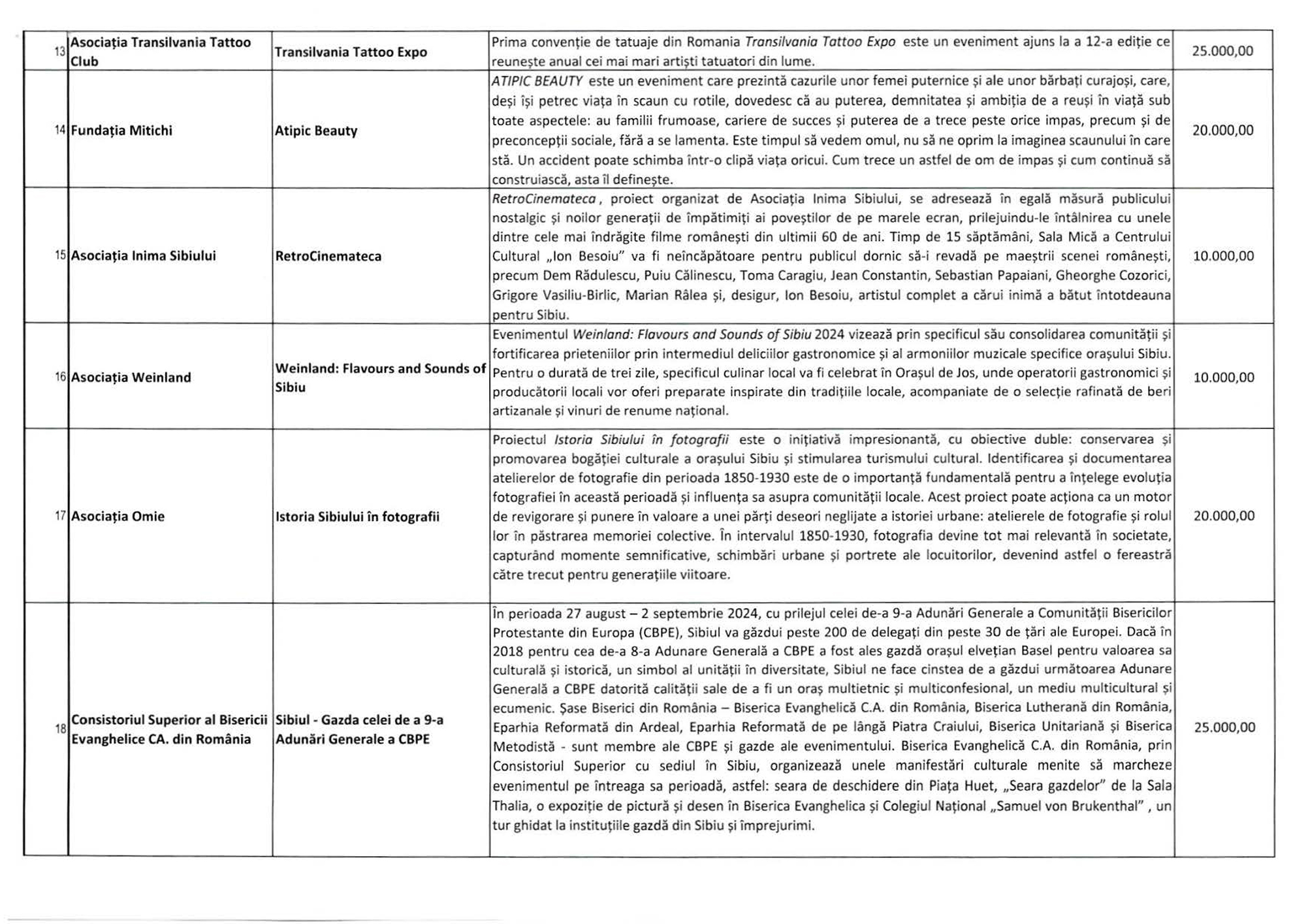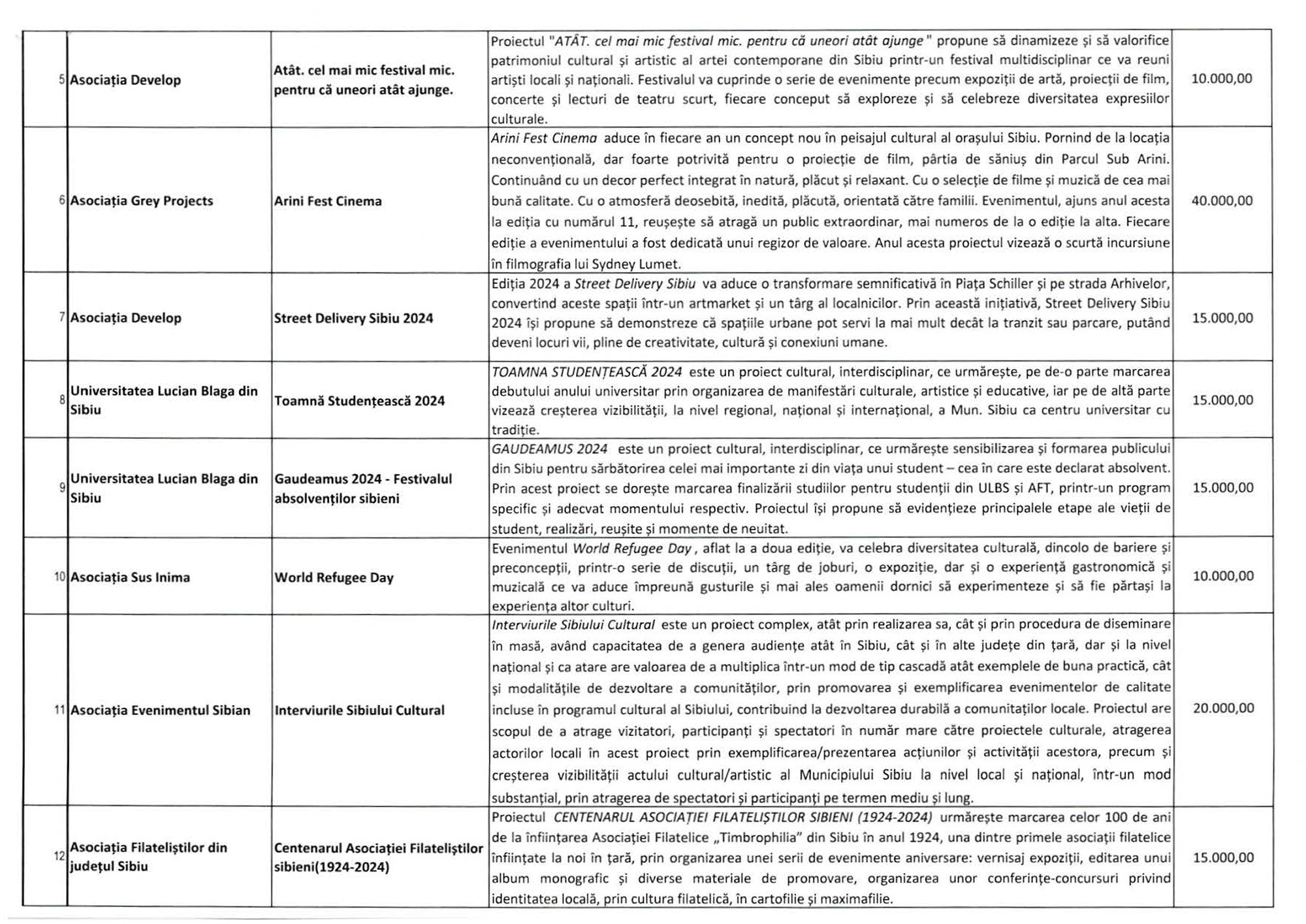 Suma maximă aici este de 75.000 lei, alocată în cazul a două proiecte: Ars Hungarica 2024 (Asociația Maghiarilor din Sibiu „HID”) și OktoberFest Sibiu (Asociația Administratorilor de Piețe din Sibiu).