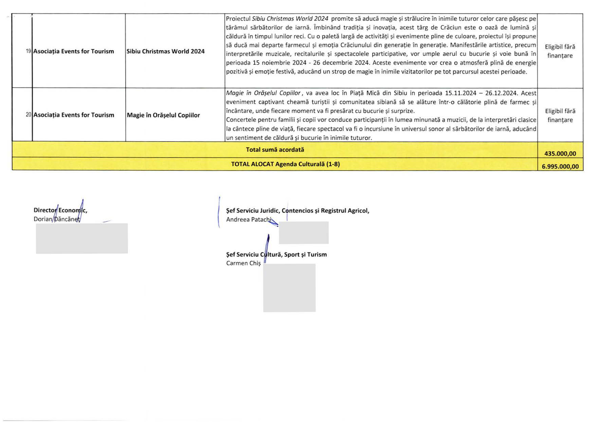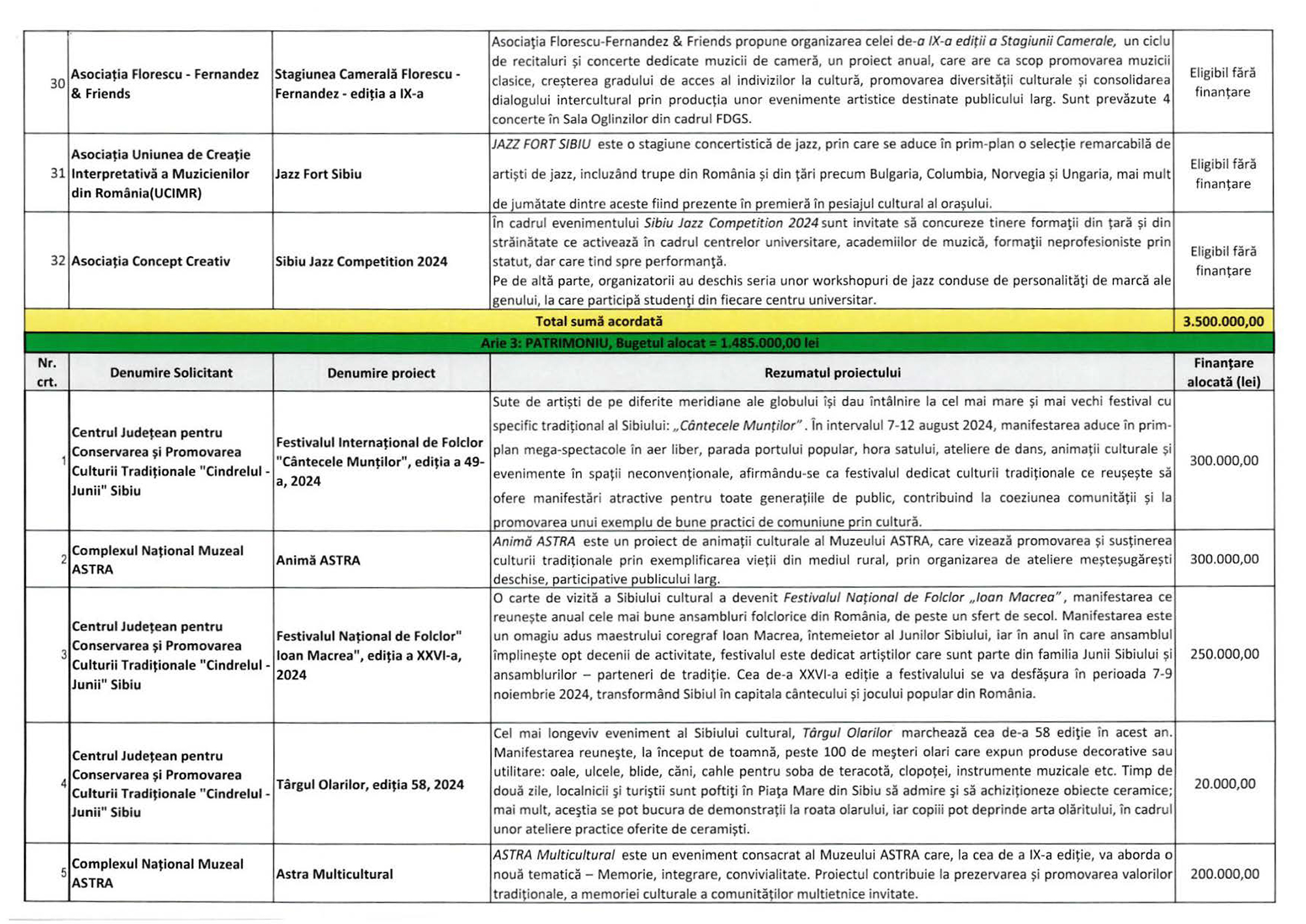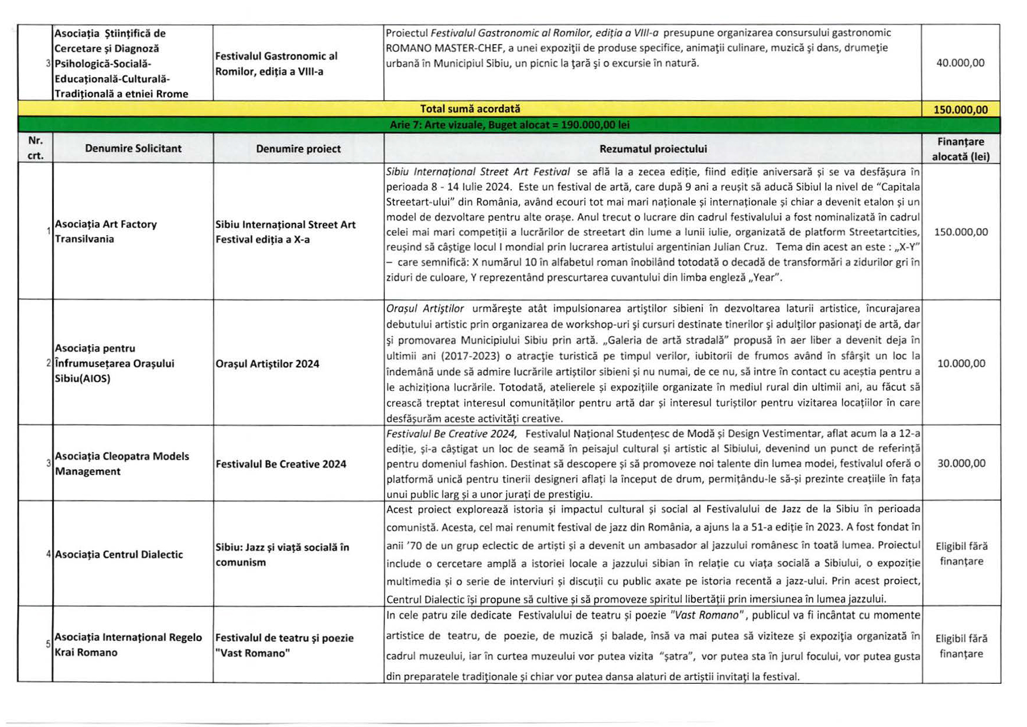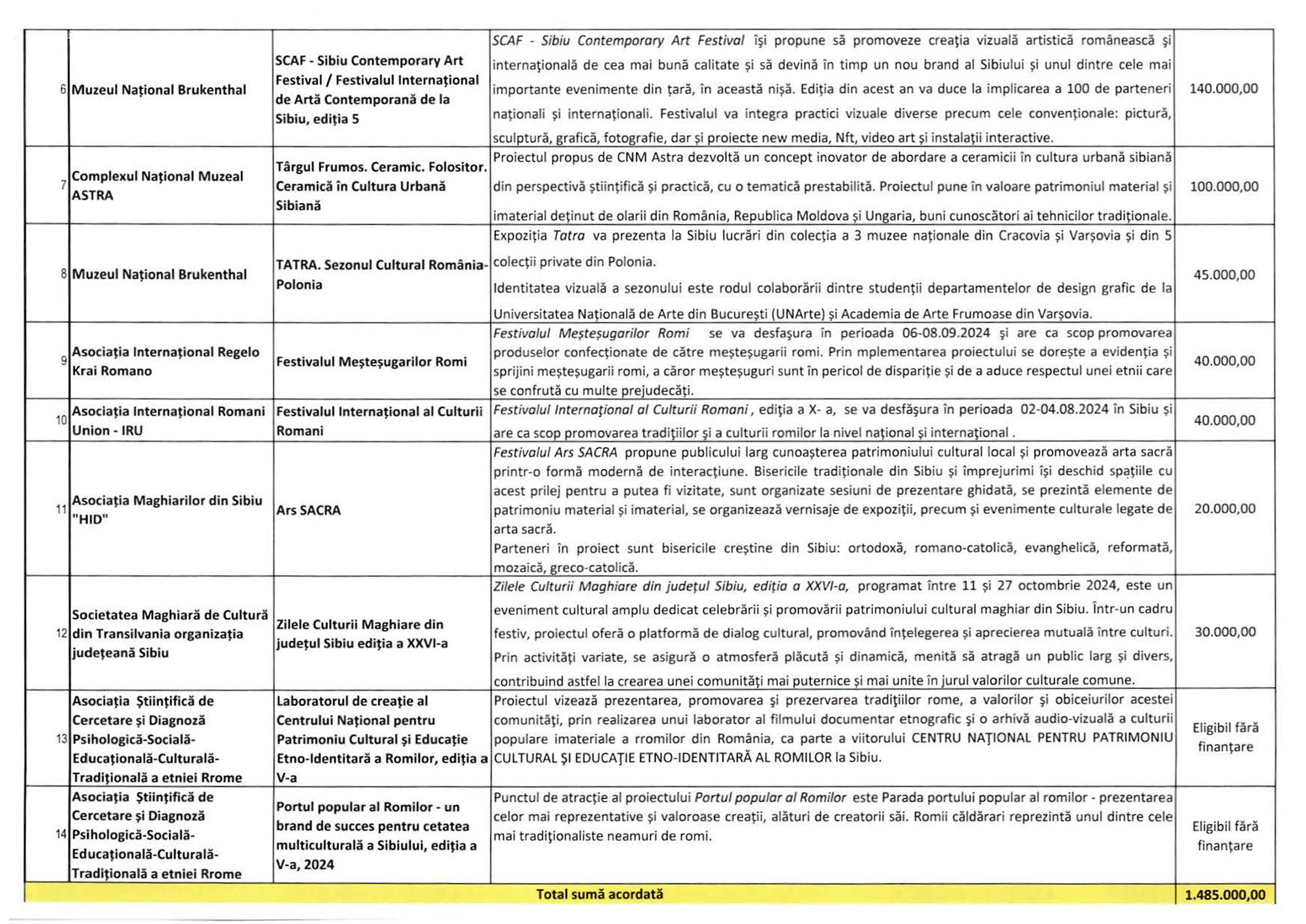 Suma maximă aici este de 75.000 lei, alocată în cazul a două proiecte: Ars Hungarica 2024 (Asociația Maghiarilor din Sibiu „HID”) și OktoberFest Sibiu (Asociația Administratorilor de Piețe din Sibiu).