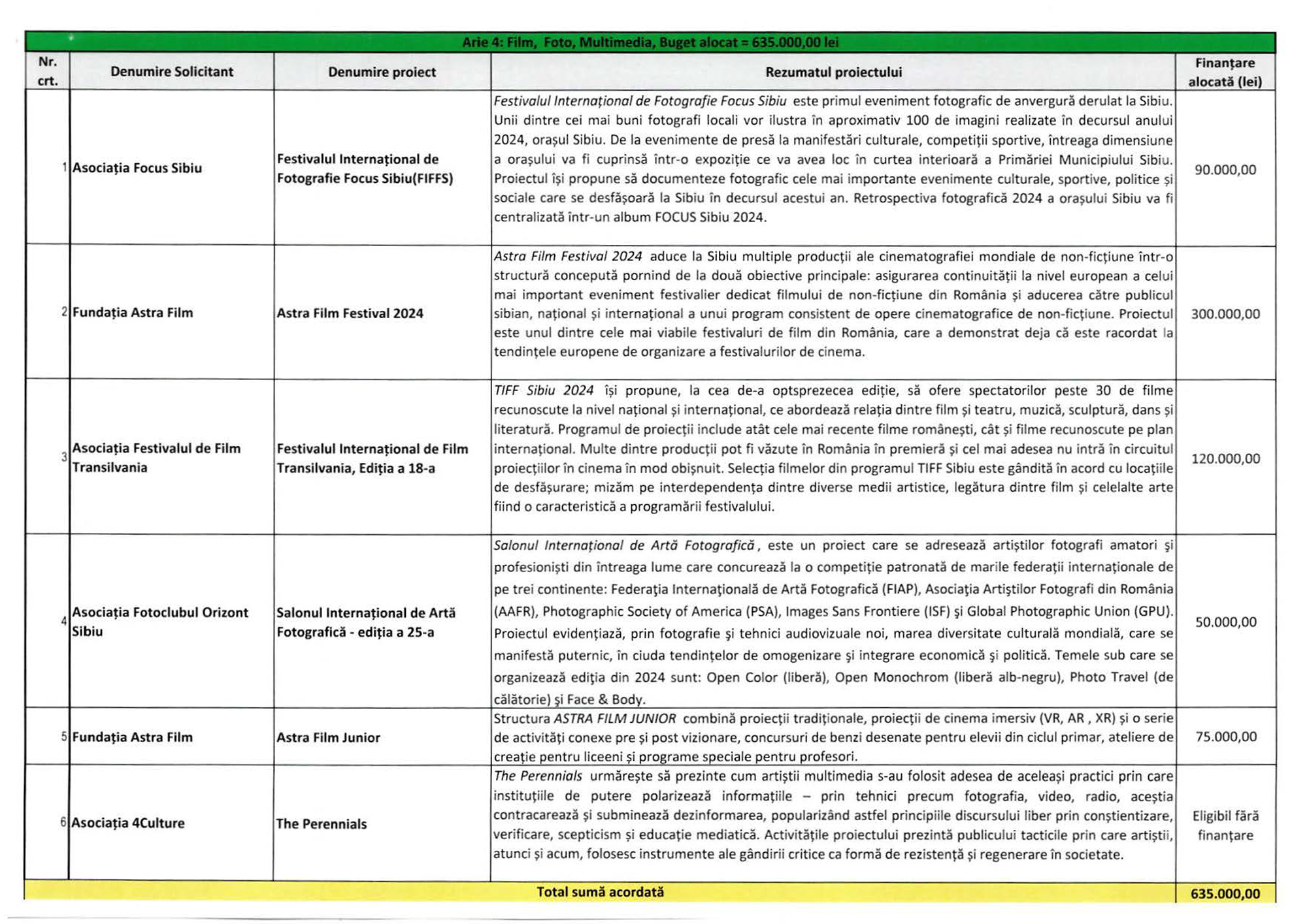 Astra Film Festival 2024 este evenimentul principal în cadrul acestei secțiuni, iar bugetul alocat este maxim – 300.000 lei. Tot aici figurează Festivalul Internațional de Film Transilvania, ajuns la ediția a 18-a, cu 120.000 lei, dar și Festivalul Internațional de Fotografie Focus Sibiu, cu 90.000 lei.