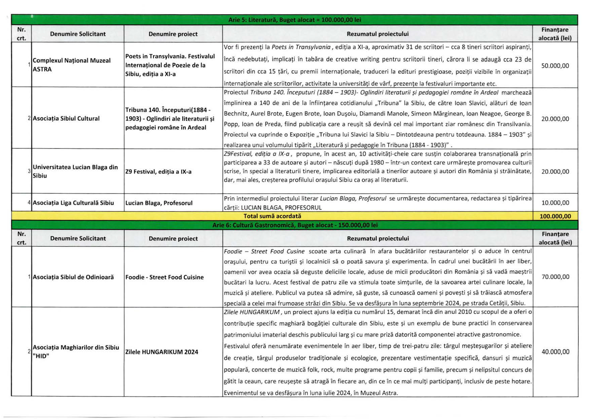 50.000 de lei este cel mai mare buget acordat unui proiect în cadrul secțiunii Literatură. Este vorba despre Poets in Transylvania – festivalul internațional de poezie de la Sibiu, ajuns la a 11-a ediție. Alte trei proiecte vor primi în total 50.000 lei: Tribuna 140. Începuturi (1884-1903) – Oglindiri ale literaturii și pedagogiei române în Ardeal (Asociația Sibiul Cultural), Z9 Festival, ediția a 9-a (ULBS) și Lucian Blaga, Profesorul (Asociația Liga Culturală Sibiu).