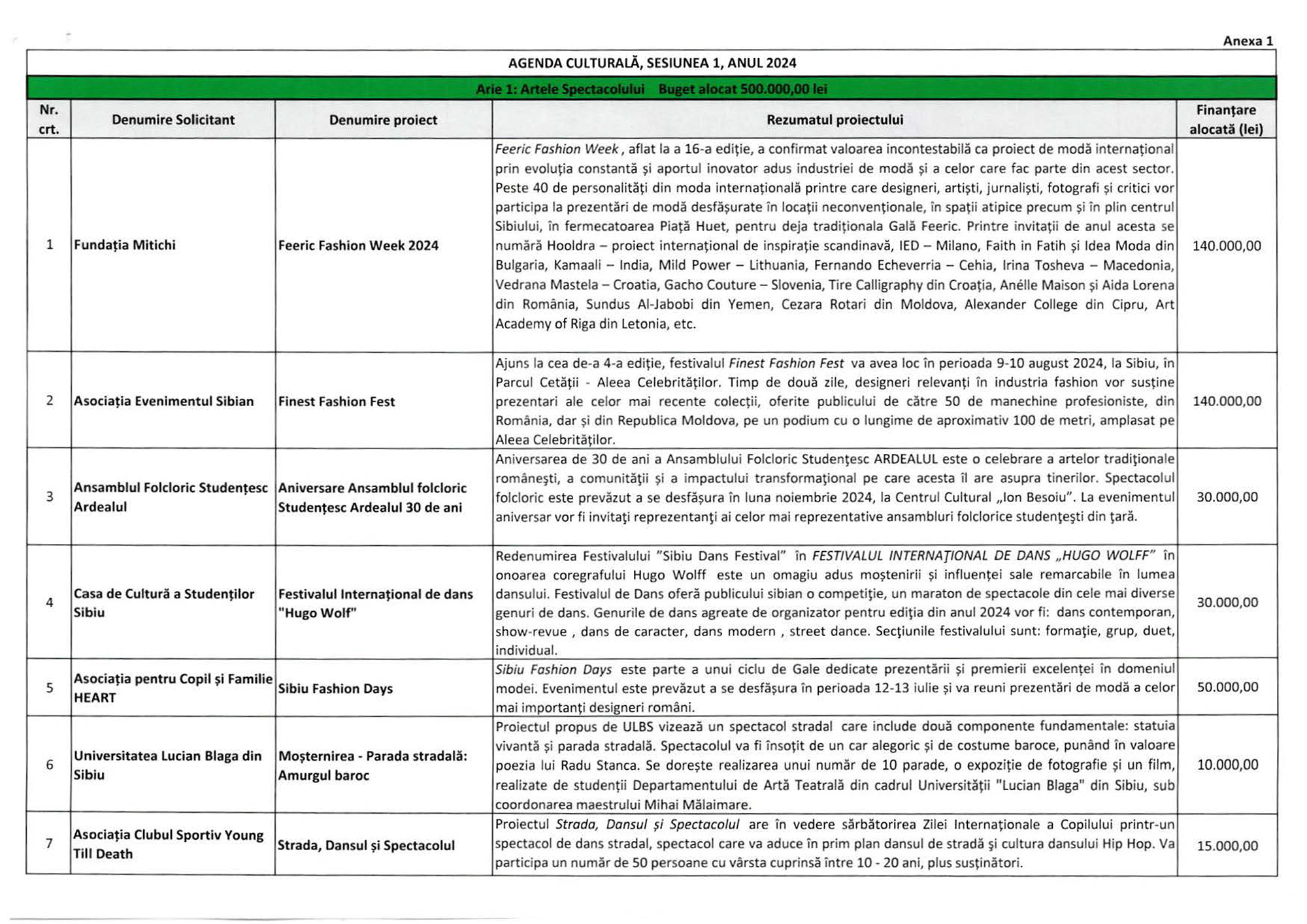 În cadrul secțiunii Artele Spectacolului, cei mai mulți bani - câte 140.000 lei - se propune să fie alocați pentru două proiecte care promovează industria de fashion sau moda: Feeric Fashion Week 2024 (Fundația Mitichi), eveniment ajuns la a 16-a ediție și caracterizat ca „proiect de modă internațional”, precum și Finest Fashion Fest (Asociația Evenimentul Sibian), ajuns la a 4-a ediție și la care sunt prezentate cele mai recente colecții din România și din Republica Moldova.