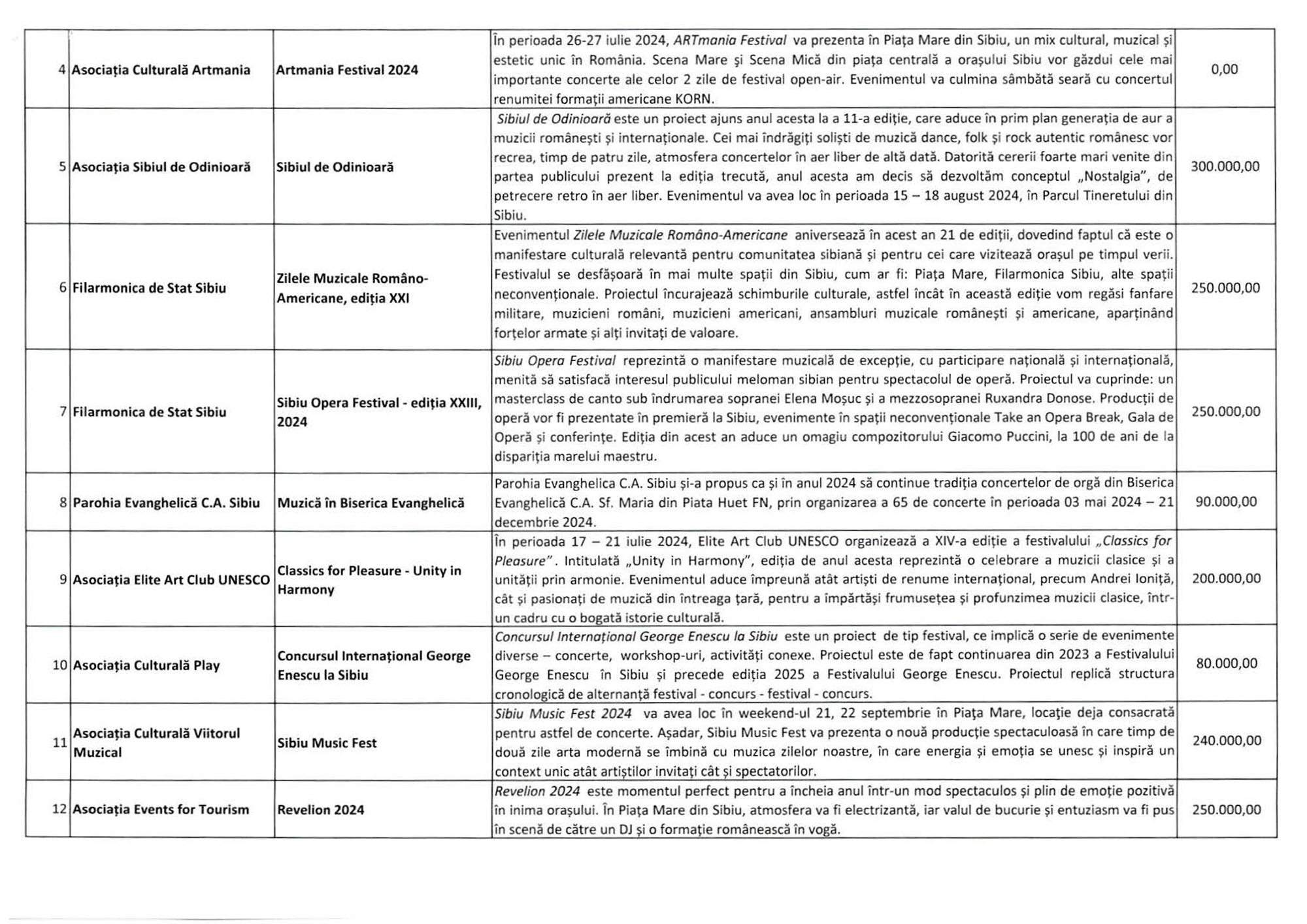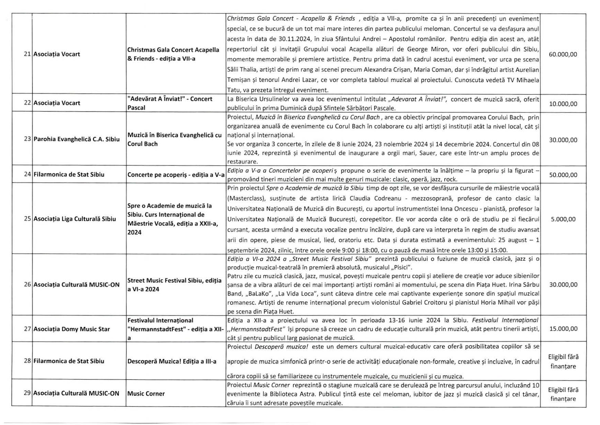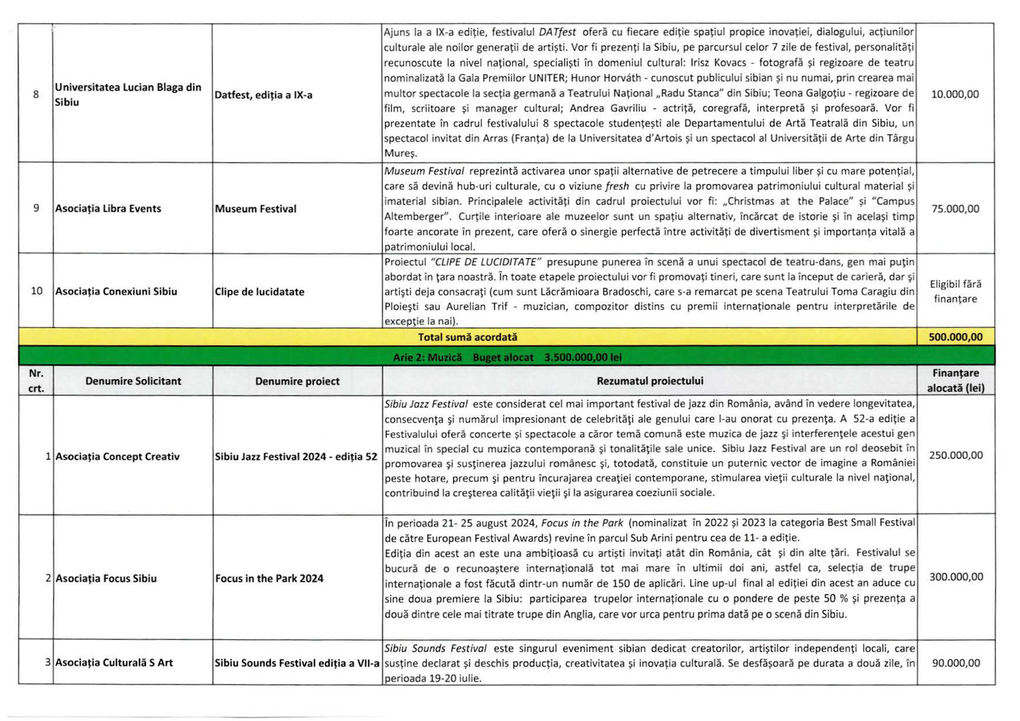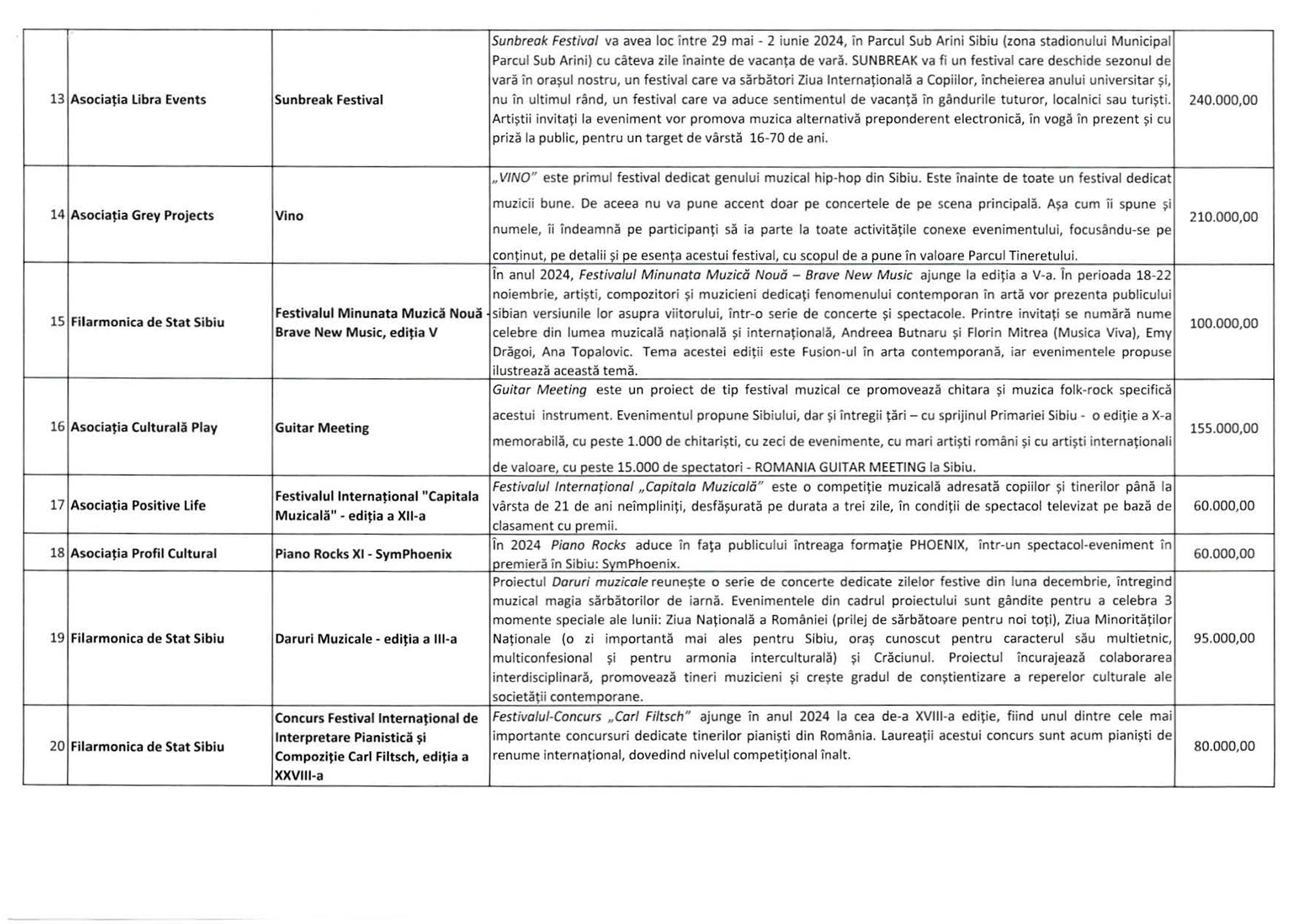 Câte 240.000 lei se propune să fie alocate pentru Sibiu Music Fest (Asociația Culturală Viitorul Muzical) și pentru Sunbreak Festival (Asociația Libra Events). Festivalul care promovează muzica hip-hop în Parcul Tineretului, Vino (Asociația Grey Projects), sunt alocate 210.000 lei, iar pentru Classics for Pleasure – Unity in Harmony (Asociația Elite Art Club UNESCO) – 200.000 lei.