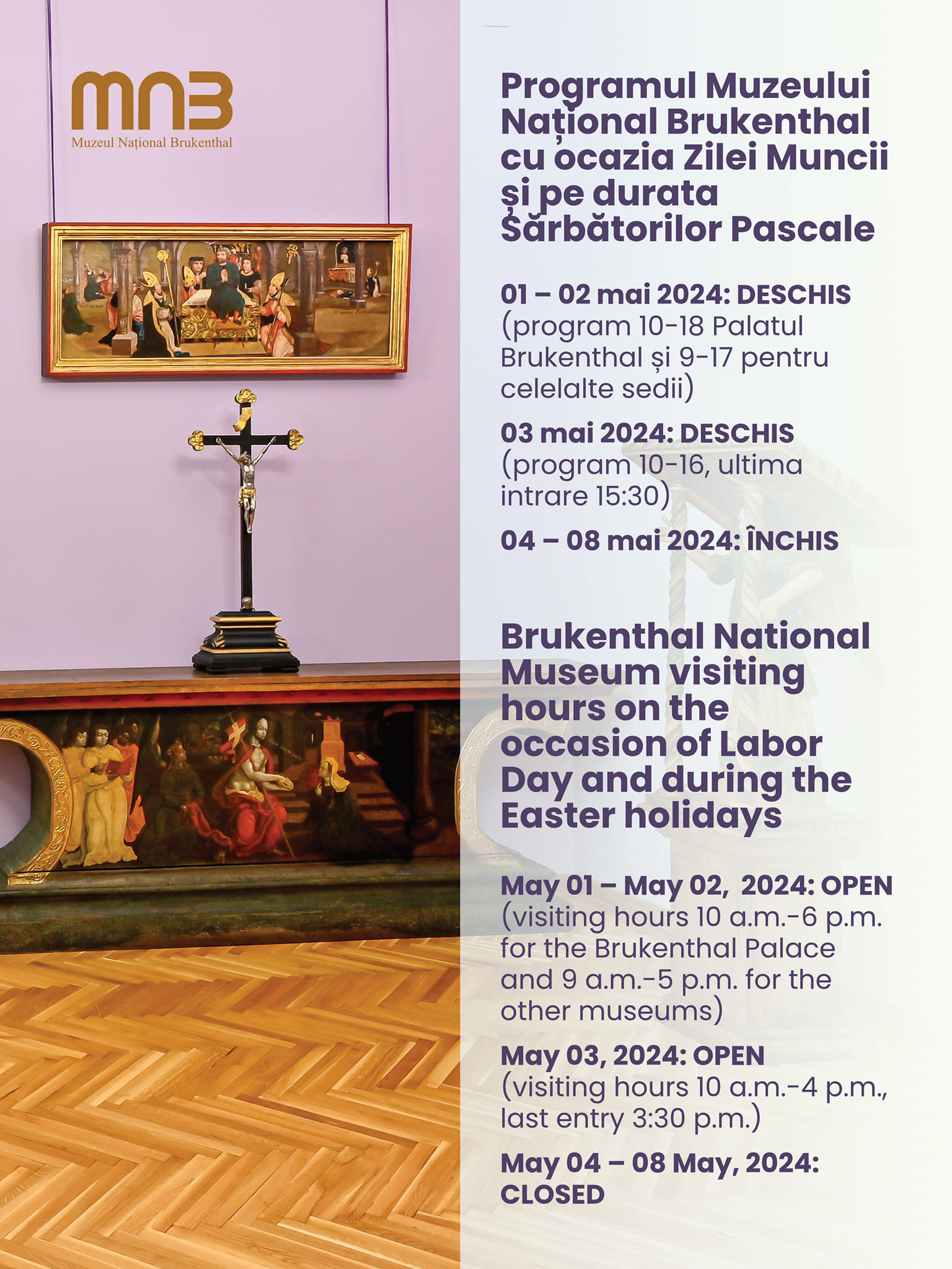 "01 - 02 mai 2024: deschis (program 10 - 18 la Palatul Brukenthal şi 9-17 la Muzeul de Istorie-Casa Altemberger, Muzeul de Istorie Naturală, Muzeul de Artă Contemporană, Muzeul de Istorie a Farmaciei şi Muzeul Cinegetic 'August von Spiess'). 03 mai 2024: deschis (program 10 - 16, ultima intrare 15:30). 04-08 mai 2024: închis", se precizează în comunicat.