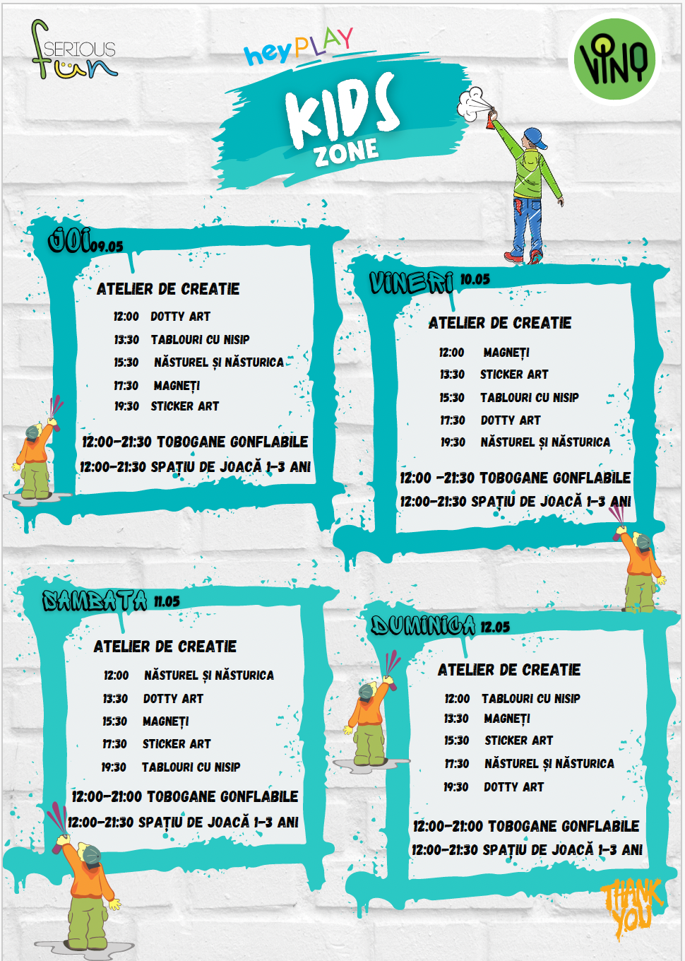 Copiii au și ei parte de multe atracții în cadrul festivalului. Zona dedicată celor mici îi așteaptă pe aceștia cu ateliere de creație, tobogane și multe jocuri interactive. ”Năsturel și Năsturica”, ”Magneții” sau ”Dotty Art” sunt doar câteva din activitățile ce vor stimula interesul copiilor.