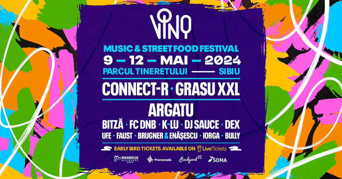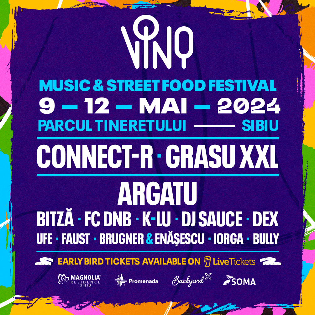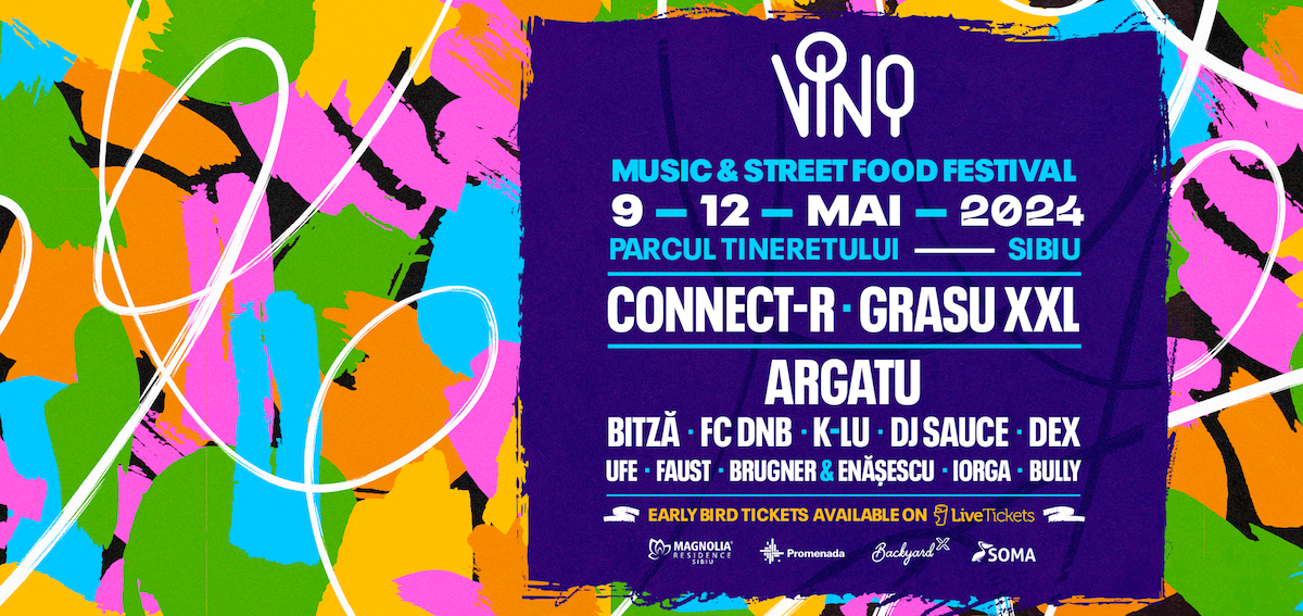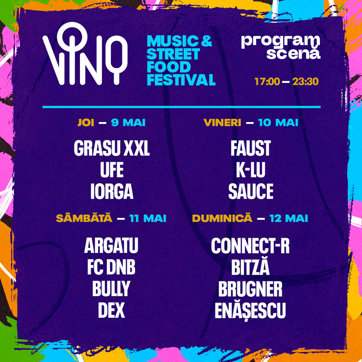 ”VINO – Music & Street Food Festival” are loc în acest an în perioada 9 – 12 mai, în Parcul Tineretului din Sibiu, iar programul zilnic de funcționare este 12.00 - 24.00.