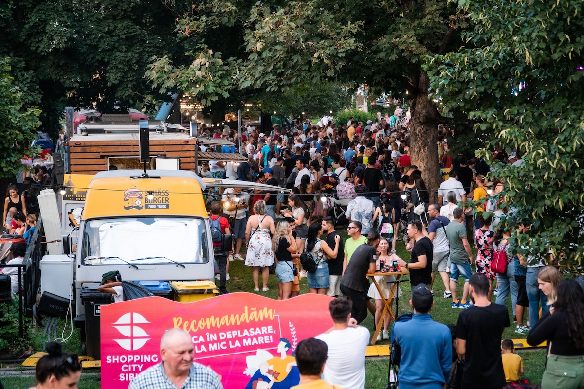Trib, Cubano Food Truck, Street Bites, Sushi Master, Sandvichology, King Potato, Arome Orientale, Cryspiteria, Schassburger, Two Chefs, Noodle Box, Atelier de Paste, Mr. Cannoli, The Cone și Olha Coffee sunt cele 17 food truck-uri care vă vor îmbia cu preparatele lor. Setea este astâmpărată de cei de la Backyard, WineNot și Bubble Bar Sibiu.