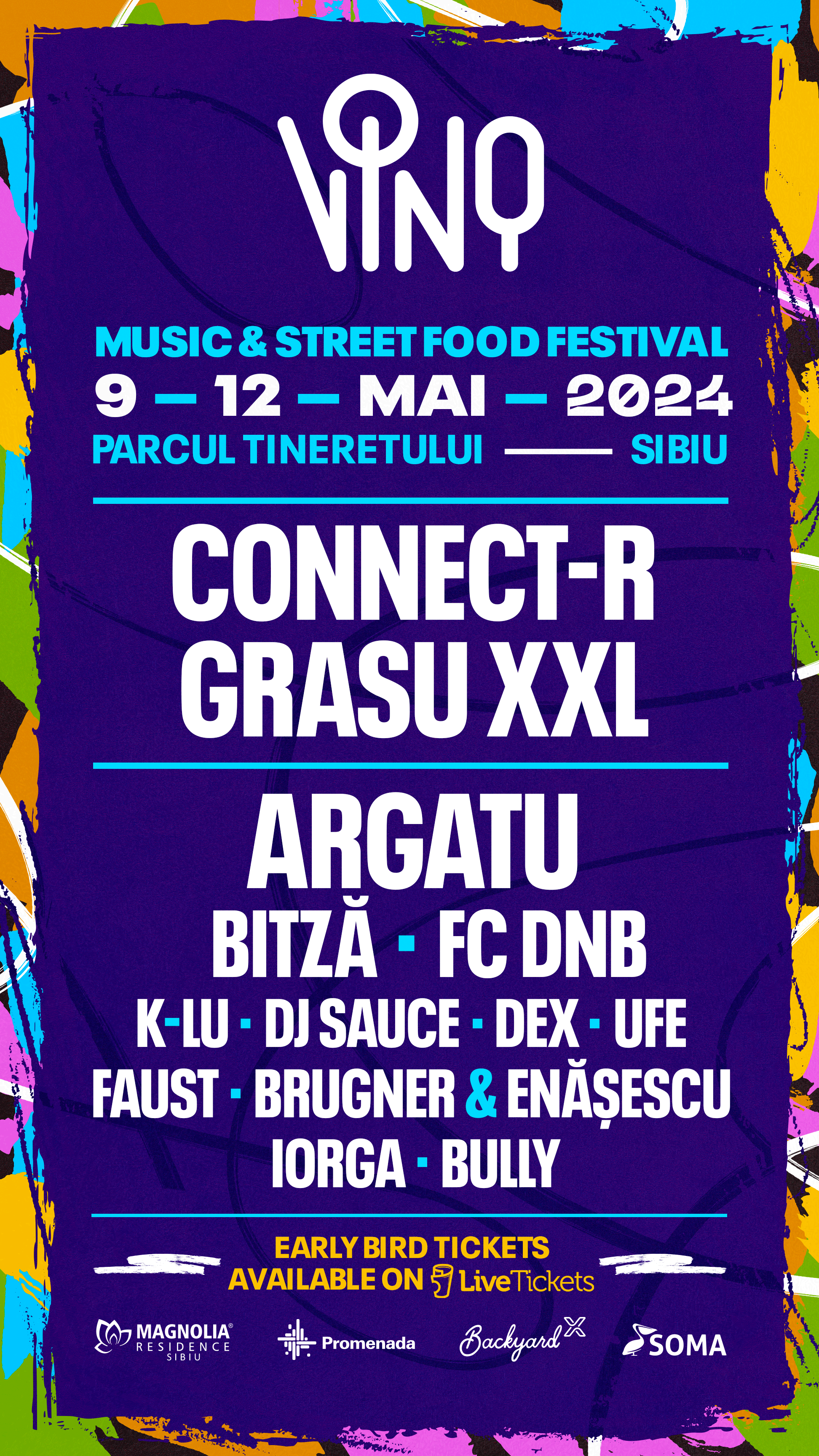 * Connect-R, Grasu XXL, Argatu, Bitză, Gojira & FC DNB, Faust, Brugner & Enășescu, K-Lu, DJ Sauce, DEX, UFe, Iorga și Bully sunt artiștii și DJ care vor perfoma la VINO.