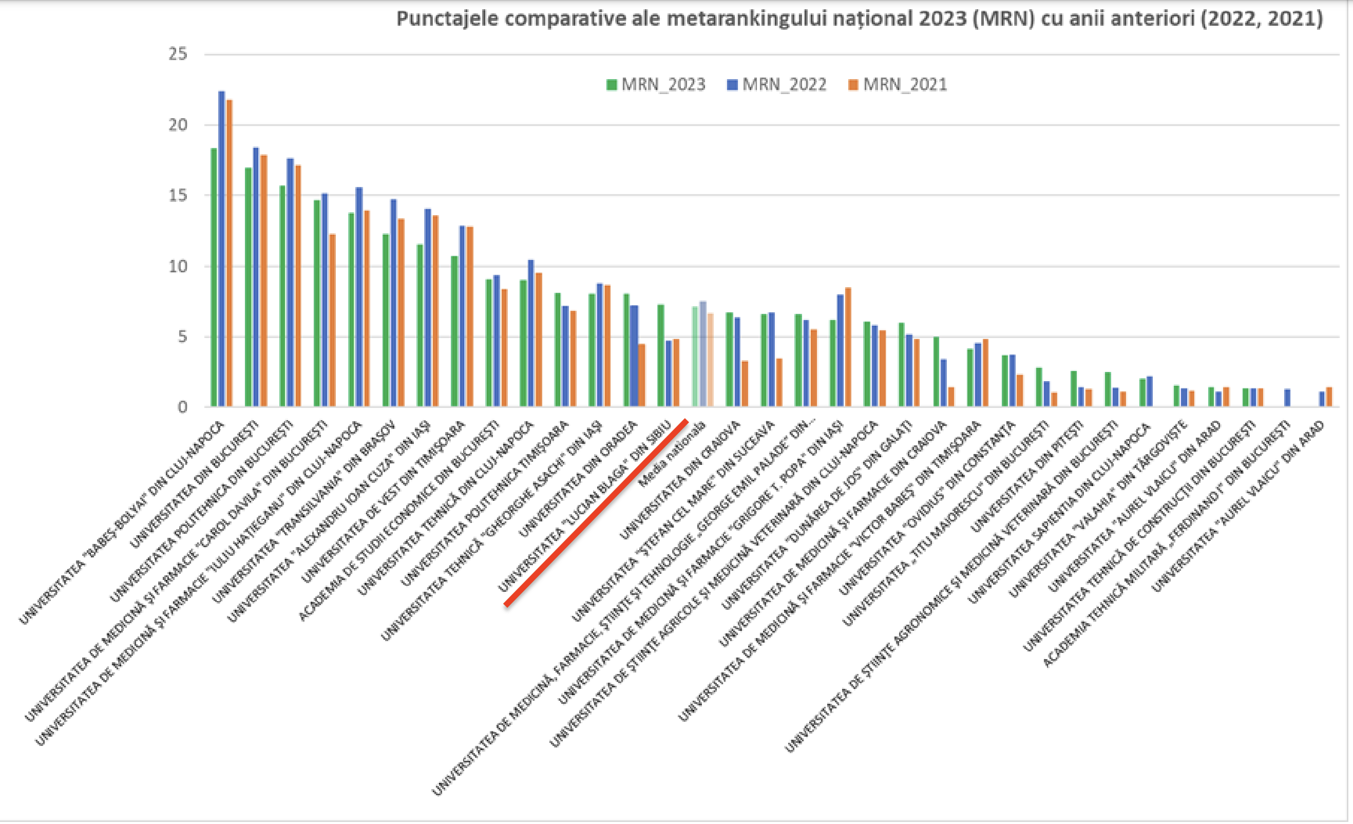 În raportul din anul trecut, Metarankingul Național pentru anul 2022, ULBS a ocupat locul 20, cu 4,721 puncte.