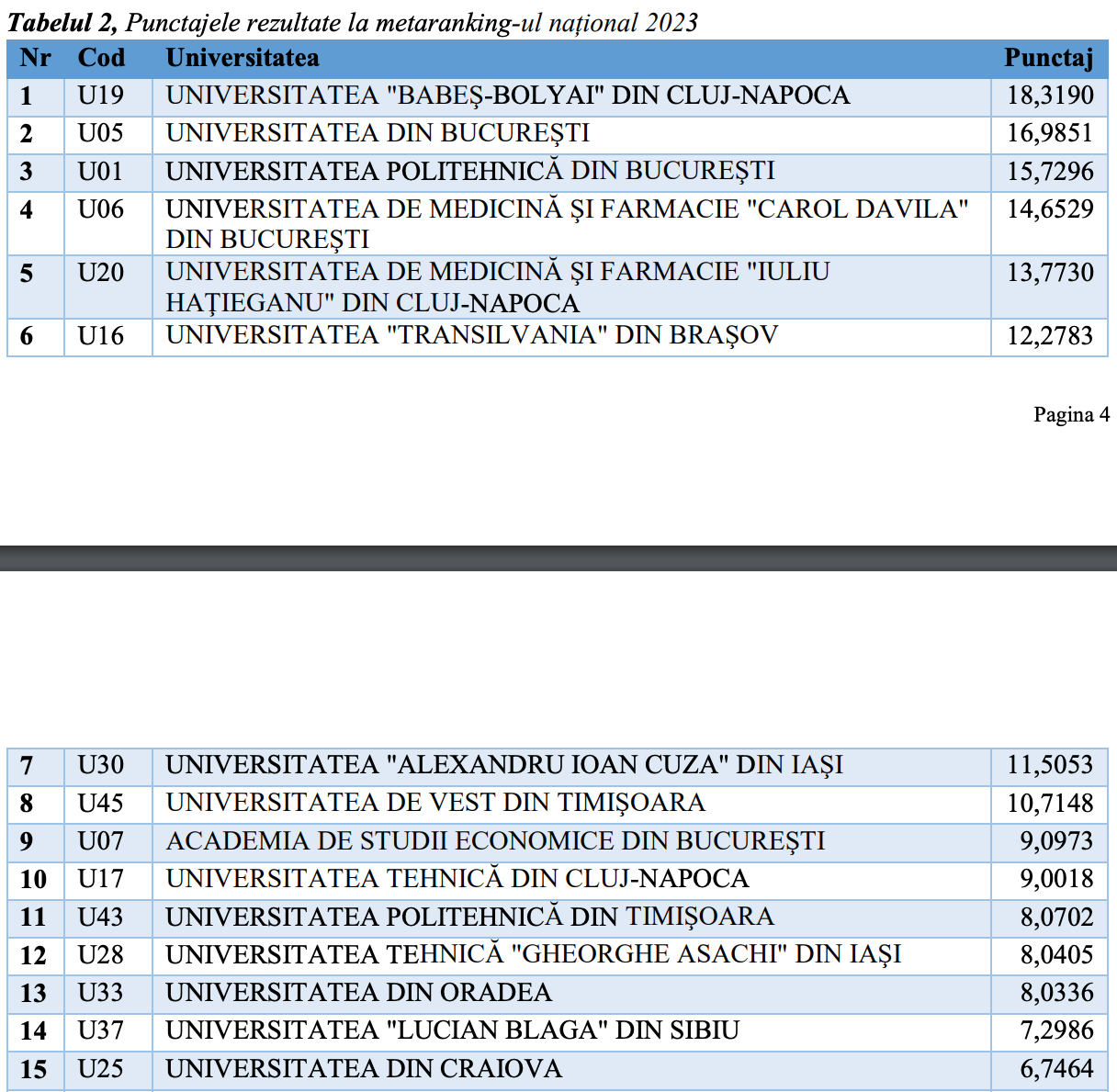 Ministerul Educației a publicat clasamentul național anual al universităților din România, numit „Metarankingul Național” aferent anului 2023. Acesta include 30 de instituții de învățământ superior.