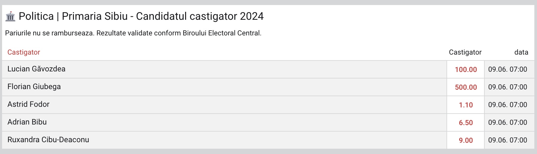 Astfel, dacă cineva ar paria că Diana Șoșoacă va câștiga Primăria Capitalei și acest lucru chiar s-ar întâmpla câștigul ar fi de 111.000 de lei, la 100 de lei pariați.