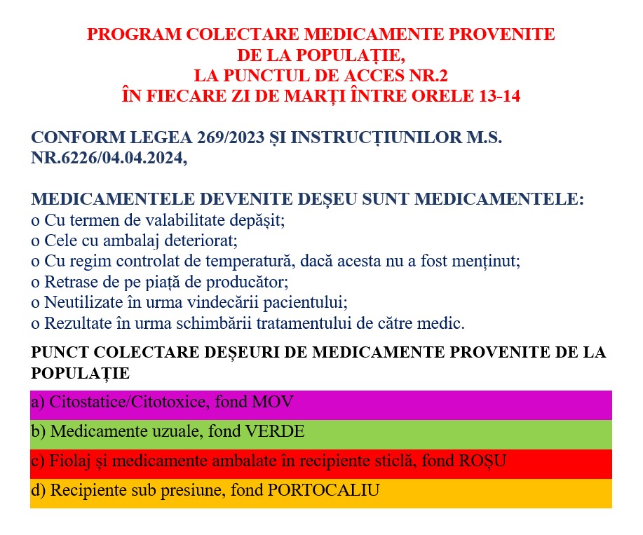 Colectarea medicamentelor provenite de la populație se va face la punctul de acces nr. 2 a spitalului..
