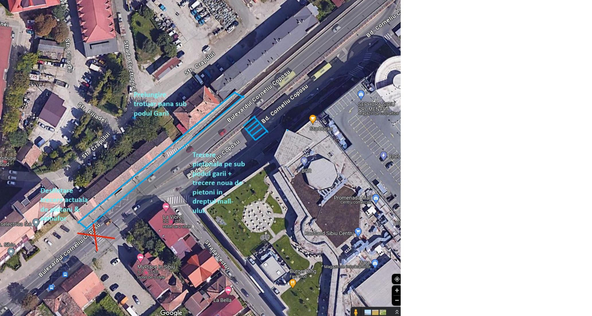Pentru „Sibiu - oraș în Mișcare” sunt propuse tot două idei. Prima vizează reconfigurarea traficului în zona Podului Gării. Cel care a propus proiectul crede că e necesară „desființarea trecerii de pietoni semaforizate de la podul Gării și crearea unei zone pietonale pe sub podul Gării pentru îmbunătățirea fluidizării traficului de mașini pe pod”. „Propun astfel modificarea străzii de lângă pod din strada cu acces auto în stradă pietonală, astfel încât trotuarul de pe partea stângă de pe Bd-ul Corneliu Copos (dinainte de pod) să continue până sub acesta, iar trecerea de pietoni care faciliteaza centrul comercial Promenada să fie mutată în drept cu intrarea principală a mall-ului, pe strada adiacientă de lângă pod. Prin această modificare se îmbunătățește timpul de așteptare a participanților la trafic, iar zona va fi mai sigură pentru pietoni & biciliști. Strada care iasa de sub pod (cea pe care o propun a fi pietonală), nu este foarte frecventată de mașini, iar oricum alternative de întoarcere spre centru există prin gară pe strada Uzinei”, explică autorul.