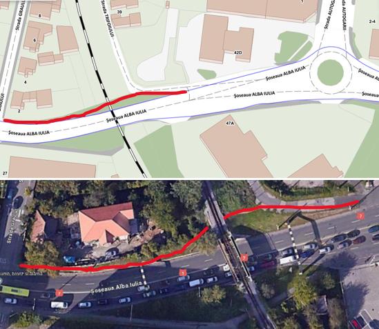Un alt proiect legat de accesibilitate este „amenajarea unui trotuar în zona căii ferate pe Șoseaua Alba Iulia”. Iată cum explică necesitatea acestuia autorii propunerii: Sectorul dintre Strada Grâului și benzinăria Petrom, pe sensul de intrate în oraș al Șoselei Alba Iulia, nu are un trotuar amenajat. Pietonii au format o potecă improvizată, care pornește de la intersecția Străzii Grâului cu Șoseaua Alba Iulia, urcând acostamentul șoselei pe niște pietre cu rol improvizat de trepte, traversează calea ferată și iese într-o alee a benzinăriei. Această potecă nu este o cale de acces civilizată și reprezintă un grad ridicat de risc, prin traversarea nesemnalizată a căii ferate. Folosirea unei rute ocolitoare, pentru cineva care pornește de la ieșirea de pe Strada Grâului, ar presupune traversarea Șoselei Alba Iulia prin zona benzinăriei Socar, parcurgerea trotuarului de pe sensul opus, care subtraversează calea ferată și apoi traversarea din nou a Șoselei Alba Iulia, în zona comercială Lidl, care totalizează 700m. Cerința proiectului este crearea unei alei tip trotuar, care să sutraverseze calea ferată, similar celui de pe sensul opus.