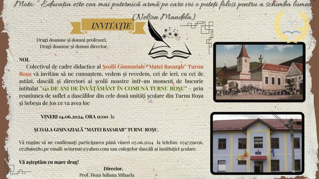 Vineri, 14 iunie, Școala Gimnazială „Matei Basarab” din Turnu Roșu va organiza evenimentul „141 de ani de învățământ în Comuna Turnu Roșu”. Manifestarea va fi cu atât mai emoționantă cu cât sunt invitați foști dascăli și directori ale celor două unități școlare ale comunei, cea din Turnu Roșu și Sebeșu de Jos.