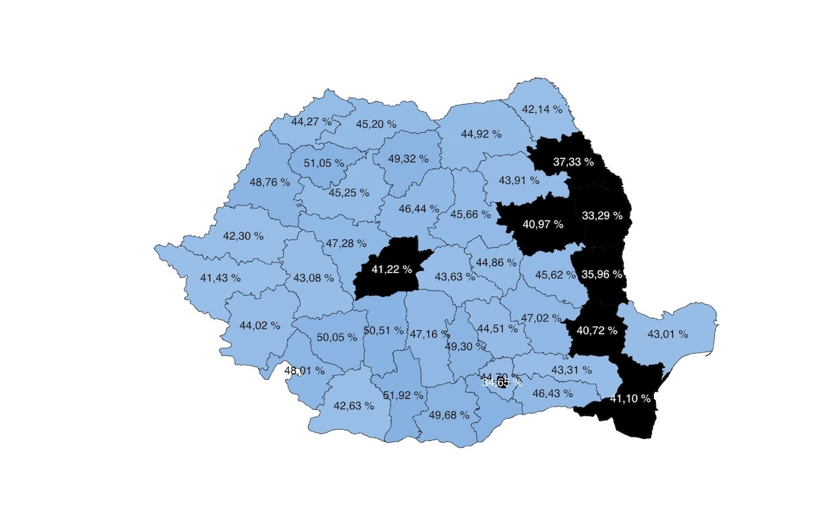 Cel mai mic procentaj este în Vaslui (21,8%), București (22,09%) și Galați (23,71%), Iași (24,33%), Cluj (25,38%) și Timiș (25,98%).