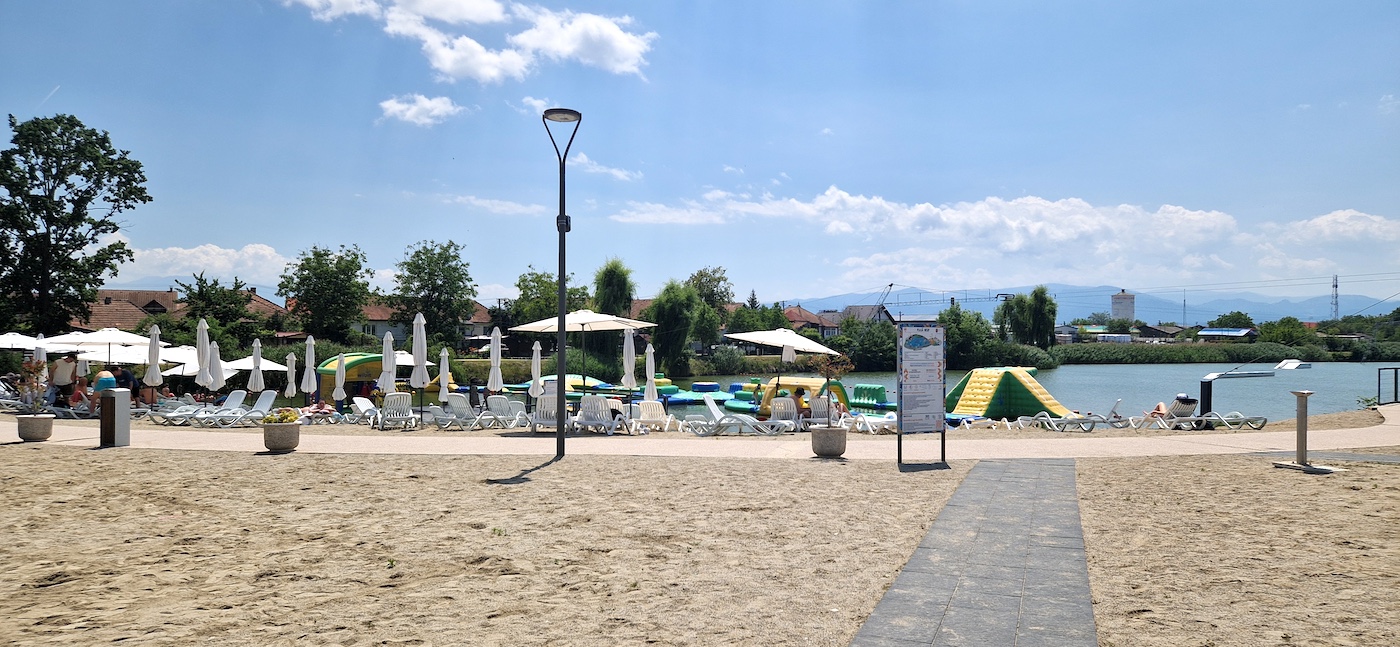 Fără nicio muzică ai cărei bași să bruieze locul – deși sunt amplasate boxe pe stâlpii de iluminat - atmosfera în care m-am relaxat la 20 de minute de la plecarea din Piața Mare a orașului era una de concediu: o baie scurtă în apa cu o temperatură numai potrivită, bere rece – fără alcool - de la chioșcul de lângă plajă, tineri care se aruncau în apă de pe pontoanele plutitoare, mame care de sub umbrelele șezlongurilor își dădăceau aproape plictisite copiii aflați la marginea apei înconjurați de tot felul de jucării, pensionari care răsfoiau picotind câte o carte, domnițe ferite de umbrele în căutarea bronzului natural, tineri care se alergau prin apă în jocuri copilărești.