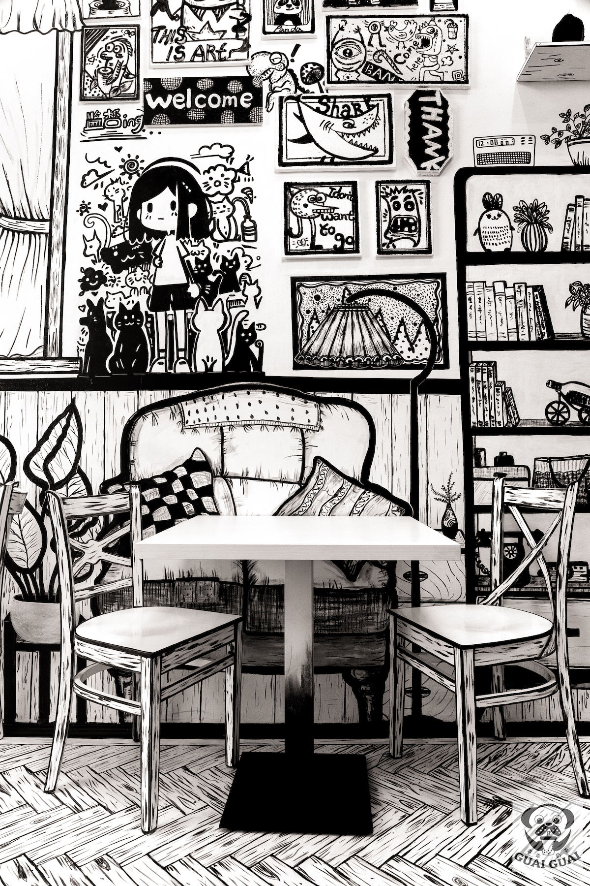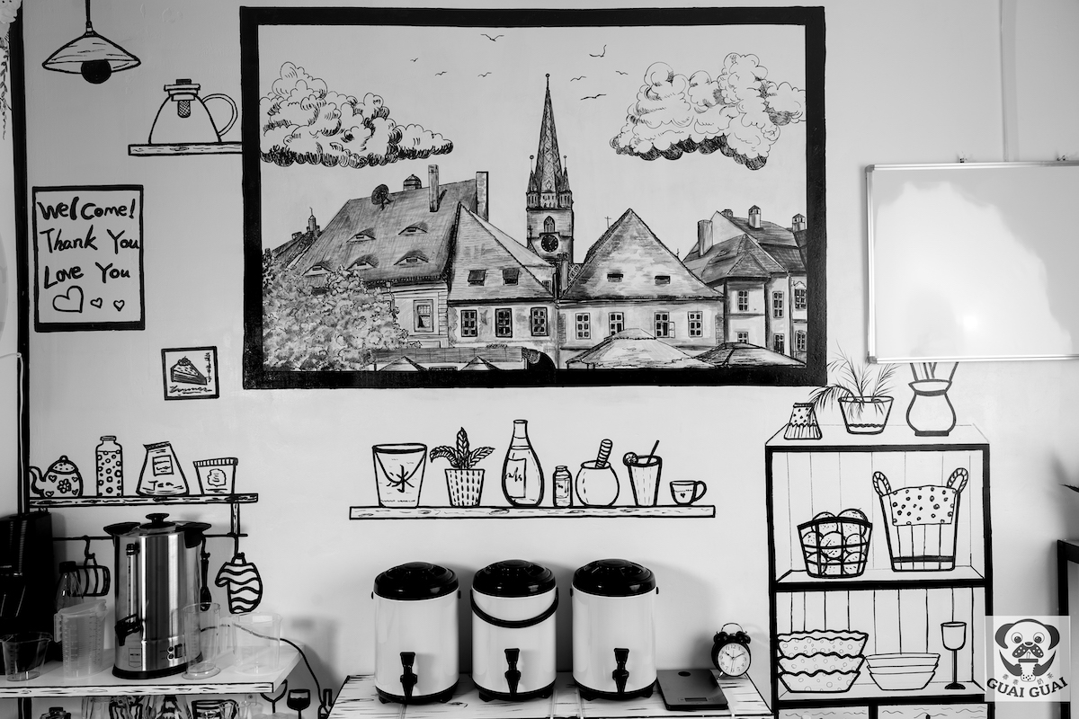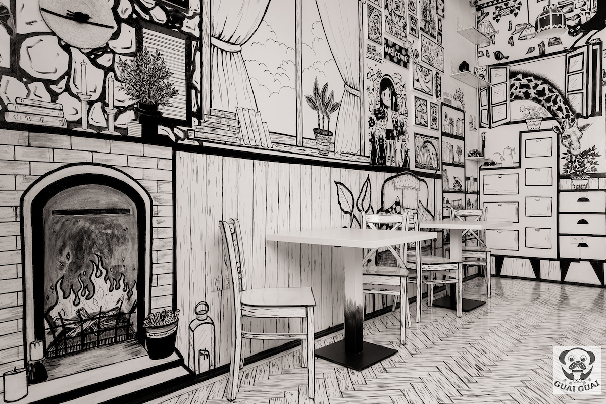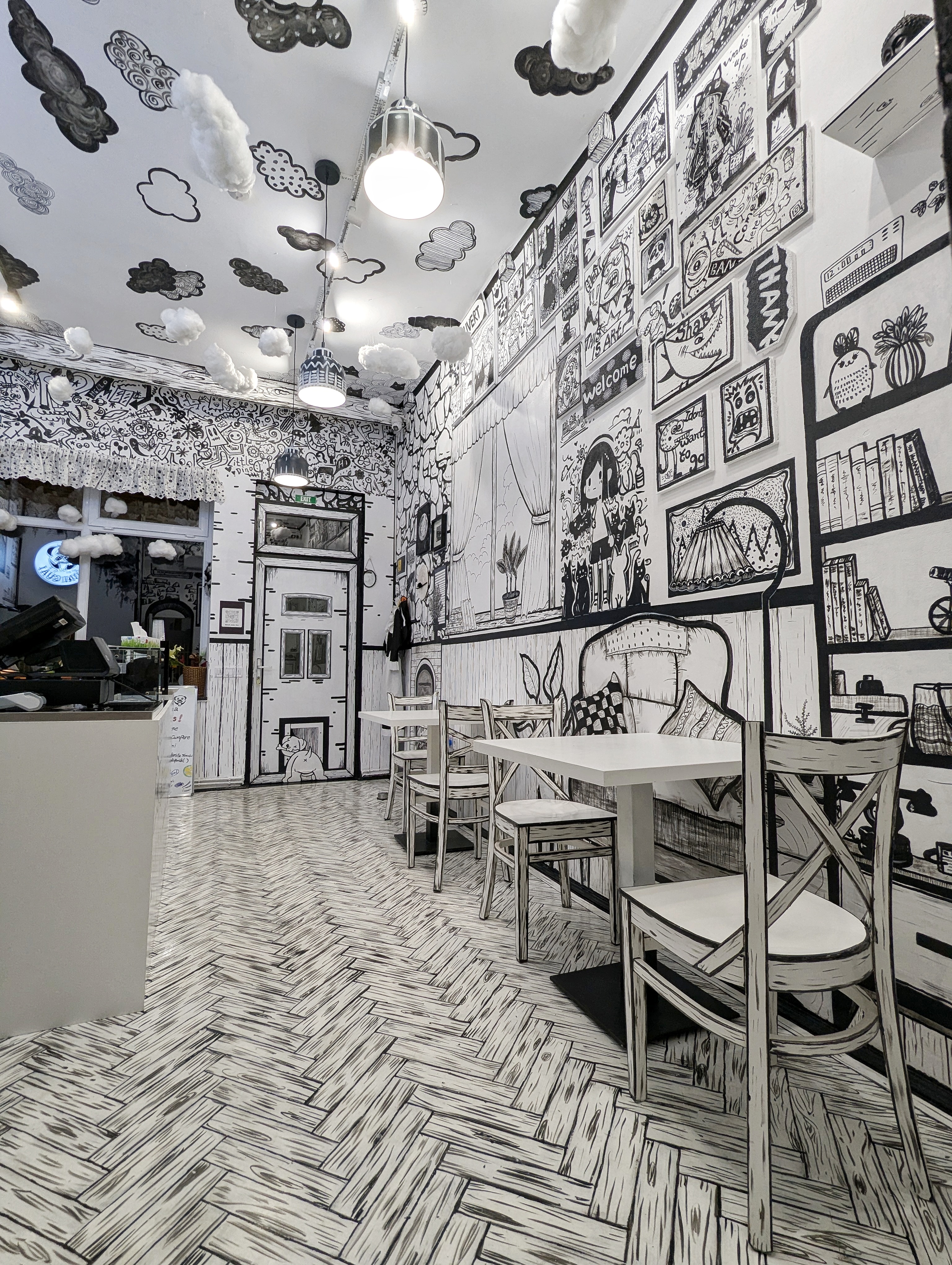 Decorul ceainăriei este cel care o face deosebită. „Desenat și pictat doar în alb și negru, 100% manual, creează senzația că pășești într-o ilustrație sau într-un cadru de bandă desenată”.
