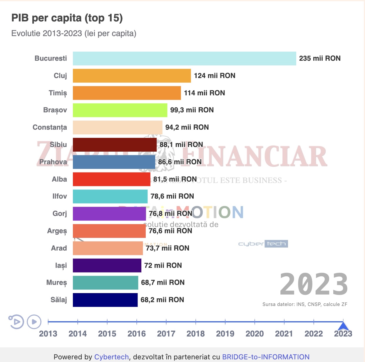 Comparaţia evoluţiei datelor la nivel de judeţe este relevantă pentru că arată atât unde se află fiecare judeţ ca nivel de dezvoltare, cât şi viteza pe care o are în dezvoltare. PIB per capita este doar un indicator, dar concentrează, într-o singură cifră, mai multe poveşti: câte investiţii a atras un judeţ, cum arată şcolile şi spitalele, câţi oameni au plecat în alte părţi sau, dimpotrivă, câţi oameni au venit, mai precizează jurnaliștii de la Ziarul Financiar.