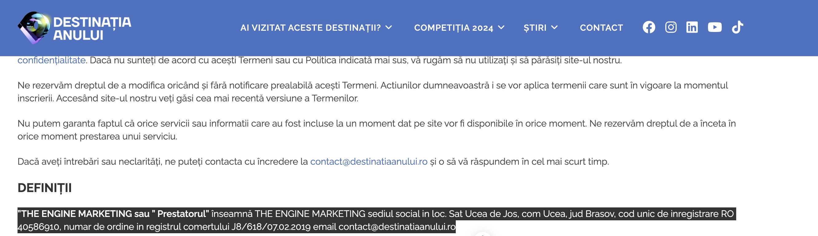 The Engine Marketing SRL este chiar firma care organizează competiţia „Destinaţia Anului 2024”, iar municipiul Sibiu a fost desemnat ”Caștigătorul Marelui Premiu Destinația Anului 2024”, în cadrul premiilor ”Orașe care te inspiră”. Locul doi a fost împărțit de Timișoara și Brașov, iar pe trei s-a clasat municipiul Iași.
