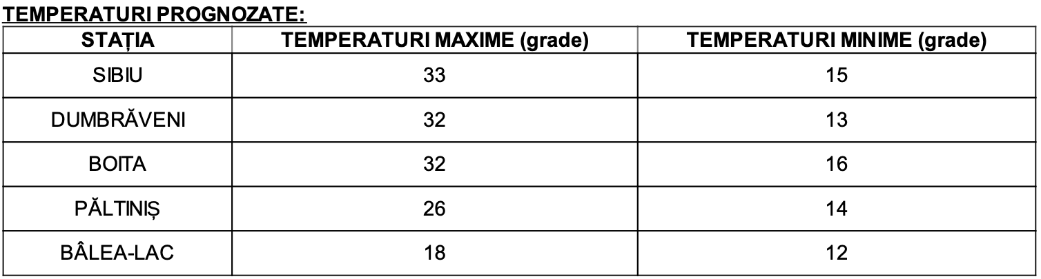 Vremea va fi călduroasă. Cerul va fi variabil. Vântul va sufla slab și moderat. Temperaturile maxime se vor încadra între 32 și 34 de grade, iar cele minime între 14 și 16 grade. În cursul după-amiezii disconfortul termic va fi ridicat, iar izolat indicele temperatură-umezeală (ITU) va atinge și depăși pragul critic de 80 de unități.