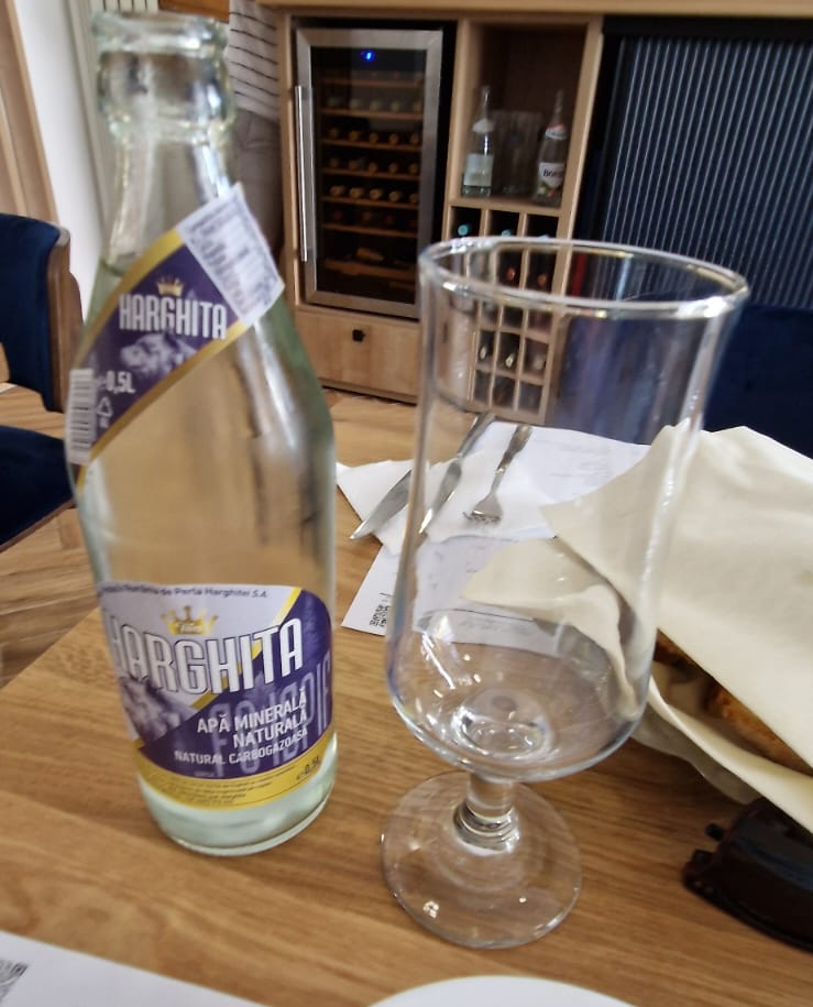Dar decât să vă descriu tochitura cu mămăligă, brânză rasă și ou ochi, mai bine vă spun ce surpriză plăcută am avut cu apa. Grand Plaza este unul dintre puținele localuri unde găsești apă minerală Harghita la sticlă, ca pe vremuri, când o țineam în pivniță la ladă și scoteam câte o sticlă la masă. Puteți spune orice, dar apa minerală la sticlă din sticlă are cu totul alt gust decât cea din plastic.